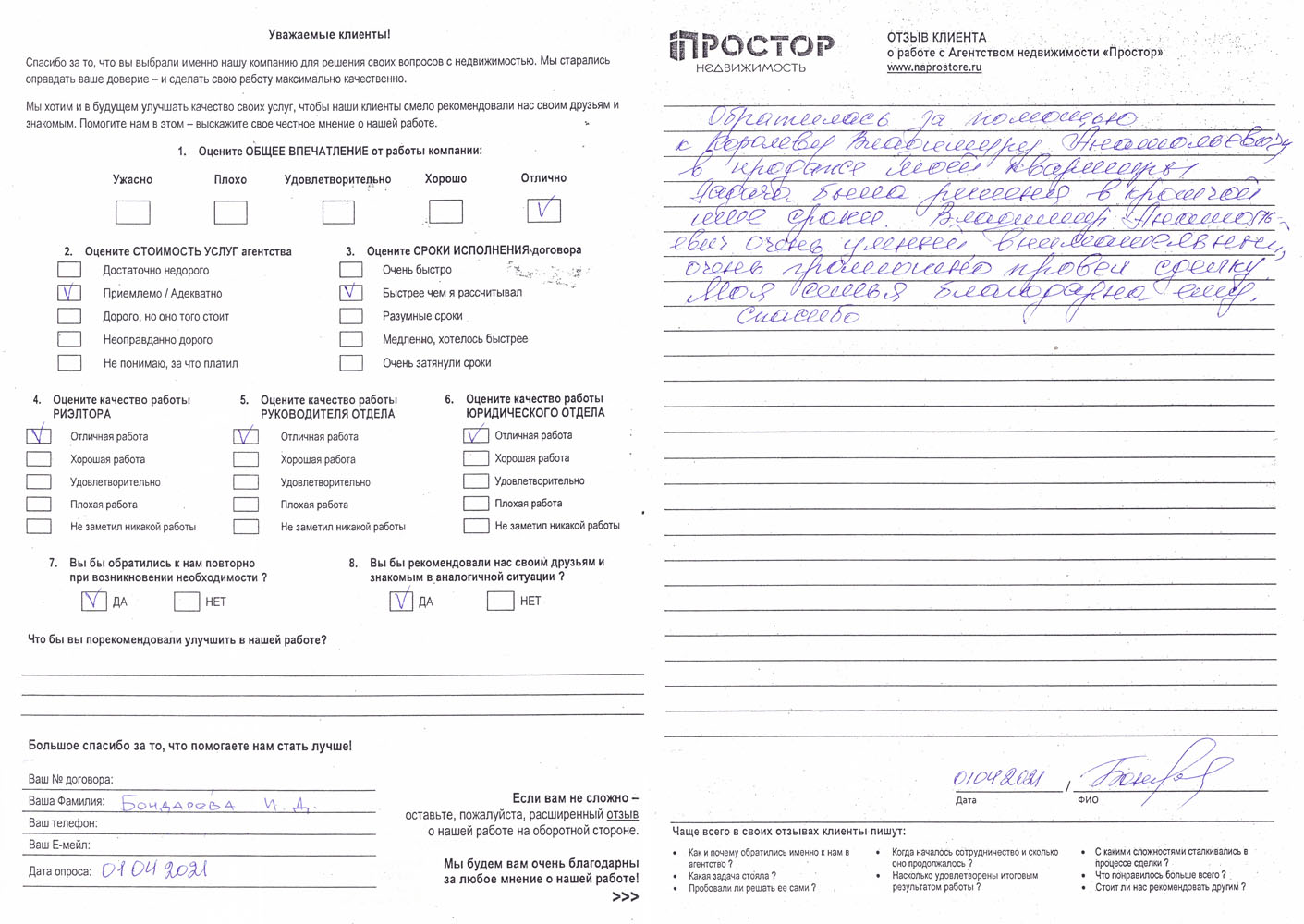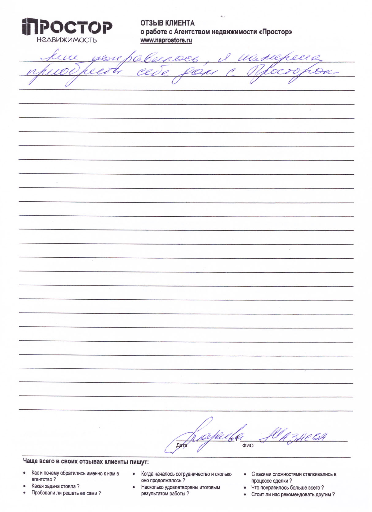 Мой продолжительный опыт общения с вами показывает, что вы меняетесь все время к лучшему! Я довольна буквально всем! Если мне нужна услуга, связанная с недвижимостью, то мой единственный выбор - всегда Простор, конечно, с Евгений Маркопольской