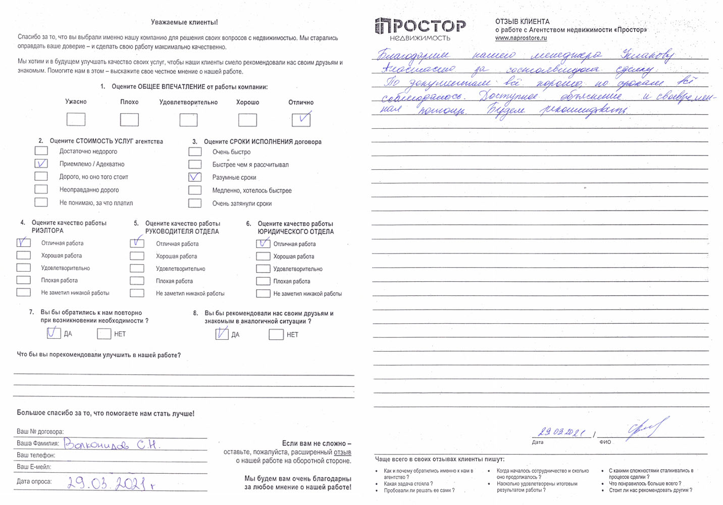 Благодарим нашего менеджера Ушакову Анастасию за состоявшуюся сделку. По документам все хорошо, по срокам все соблюдалось. Доступное объяснение и своевременная помощь. Будем рекомендовать.