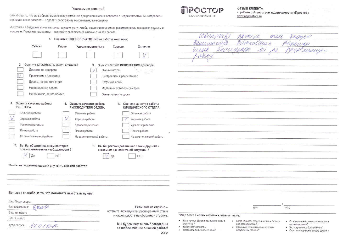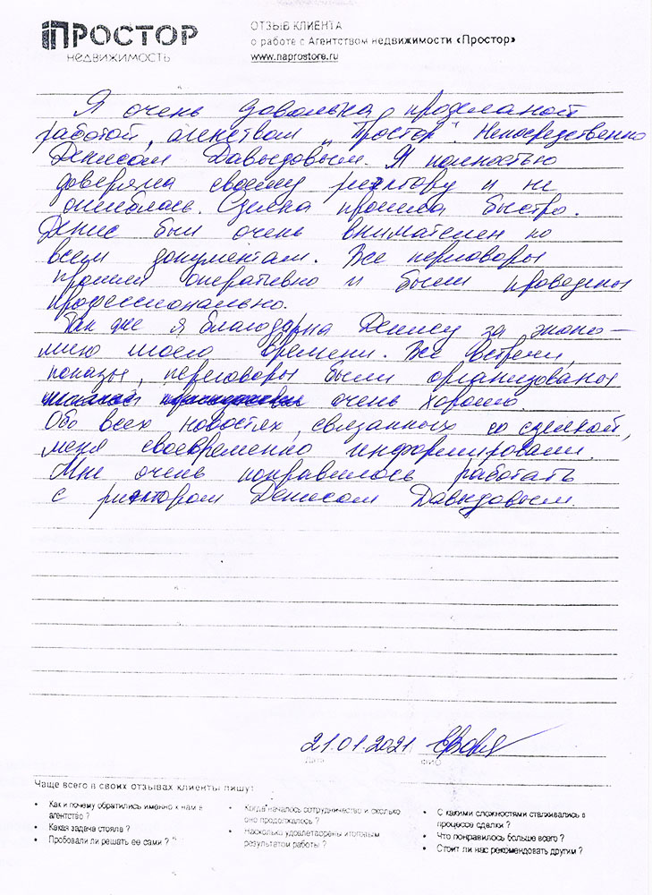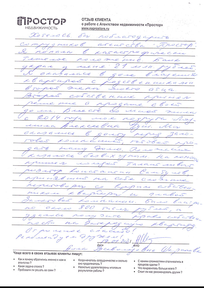 Хотелось бы поблагодарить сотрудников агентства «Простор». Я попала в катастрофически тяжёлое положение. Банк украл у меня 21 млн. рублей. Я оказалась в доле владения квартиры с родственниками второй жены моего отца. Второй собственник принял решение о продаже своей доли. Вместе со мной жила с 2014 года моя подруга Людмила Алексеевна Туш. Мы оказались в долгу перед залоговой компанией, готовой продать нашу долю. Положение казалось безвыходным. На помощь пришёл молодой талантливый риэлтор Константин Самбулов, принявший на себя сложные переговоры со вторым собственником квартиры и главой залоговой компании. Было выиграно около 600 000 руб. и удалось получить право собственности на загородную квартиру. Огромное спасибо! Рекомендуем друзьям!