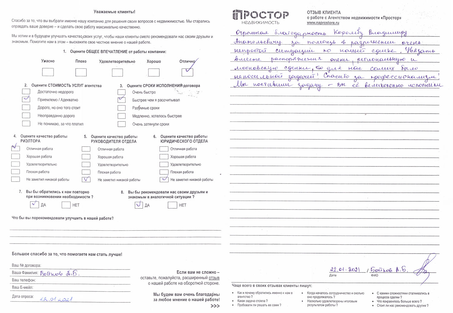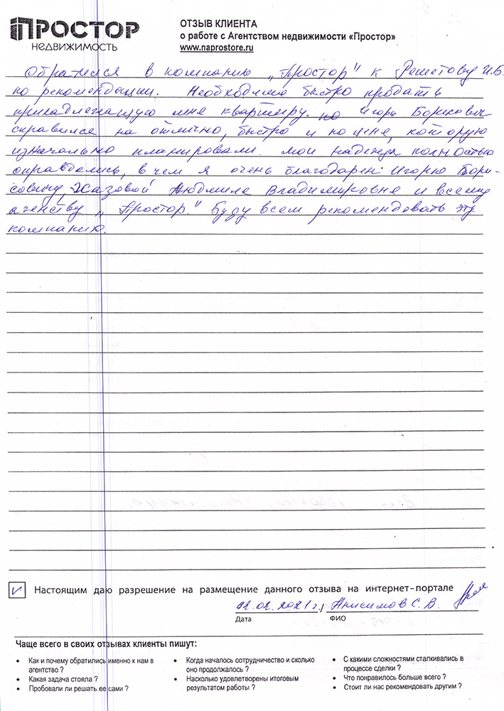 Повторно обратился к АН «Простор», снова все прошло хорошо и я доволен тем, как проходил весь процесс по продаже квартиры. Спасибо Ольге Меньшиковой и Юлии Рощикулиной за проведенную работу! Все прошло быстро, динамично и всегда в контакте по всем вопросам, отдельный большой плюс, что окончательная стоимость продажи получилась даже чуть больше предполагаемой сначала!