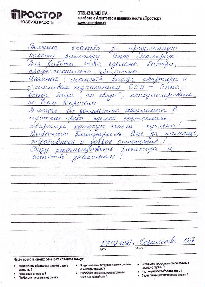 Большое спасибо за проделанную работу риэлтору Анне Малярчук. Вся работа была сделана быстро, профессионально, грамотно. Начиная с момента выбора квартиры и заканчивая подписанием ДКП – Анна всегда была «на связи», консультировала по всем вопросам. В итоге – все документы оформлены в короткие сроки, сделка состоялась, квартира, которую хотела – куплена! Выражаю благодарность Анне за помощь, оперативность и доброе отношение! Буду рекомендовать риэлтора и агентство знакомым.
