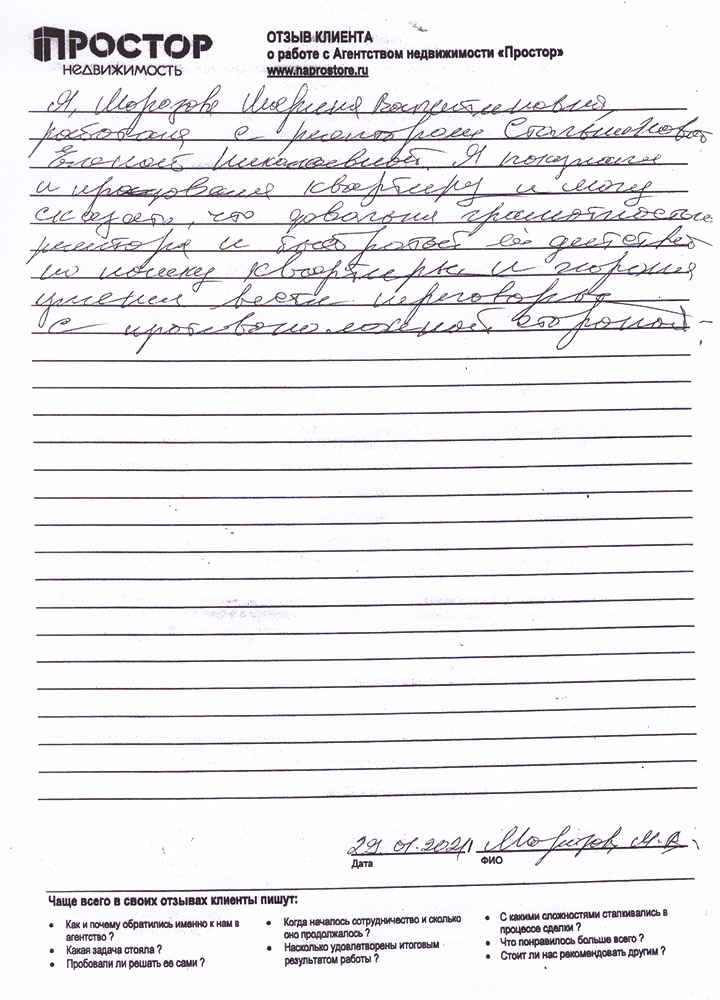 Огромное спасибо агентству недвижимости «Простор» за проведение сложной сделки с долей квартиры. Особое спасибо Константину и Илии за профессиональную работу. Кроме слов благодарности, могу отметить доброжелательность, умение работать с клиентами, даже такими непростыми, как в нашем случае. Ещё раз огромное спасибо.
