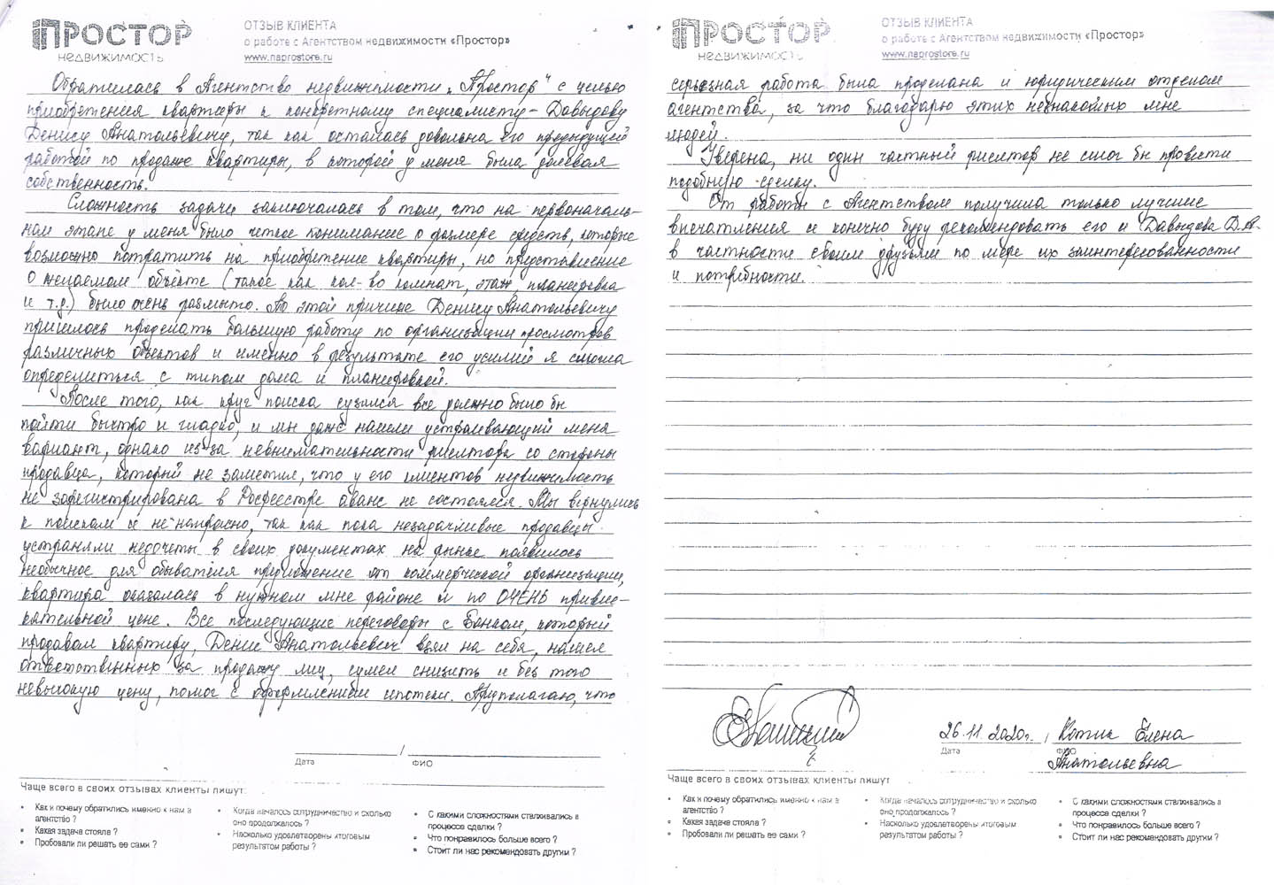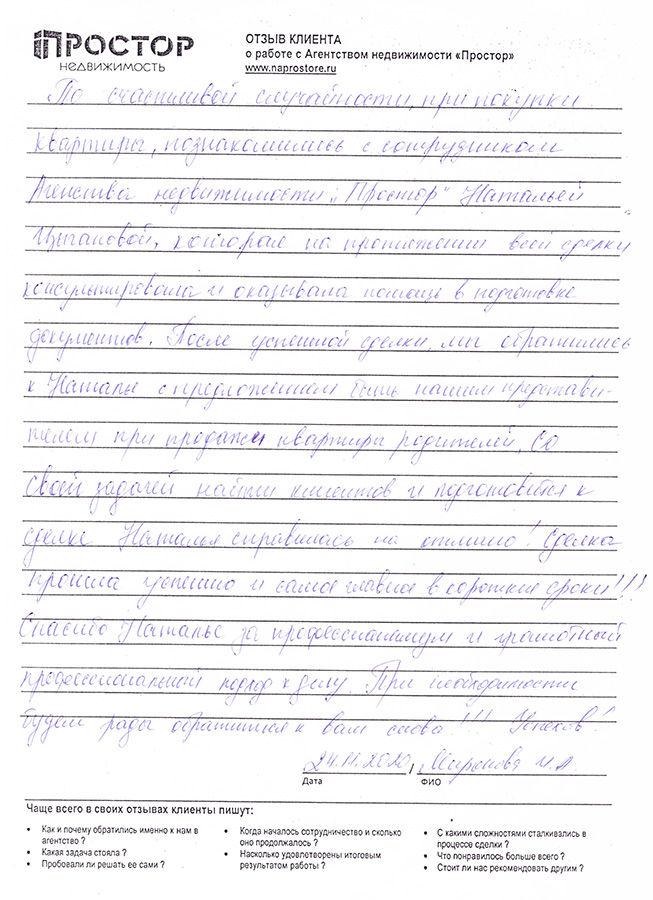 По счастливой случайности, при покупке квартиры, познакомились с сотрудником Агентства недвижимости «Простор» Натальей Цыгановой, которая на протяжении всей сделки консультировала и оказывала помощь в подготовке документов. После успешной сделки, мы обращались к Наталье с предложением быть нашим представителем при продаже квартиры родителей. Со своей задачей - найти клиентов и подготовиться к сделке Наталья справилась на отлично! Сделка прошла успешно и самое главное в короткие сроки!!! Спасибо Наталье за профессионализм и грамотный профессиональный подход к делу. При необходимости будем рады обратиться к вам снова!!! Успехов!