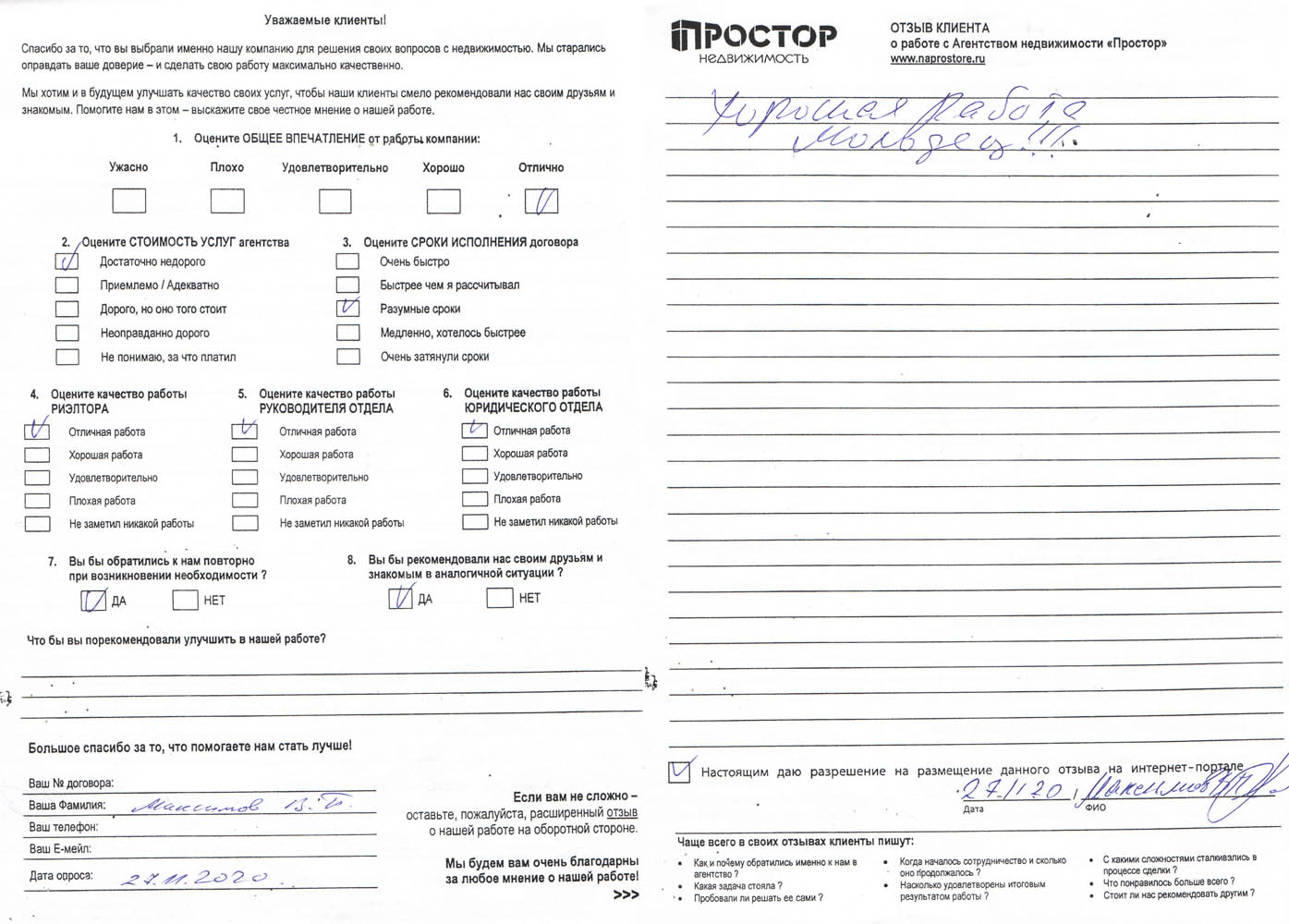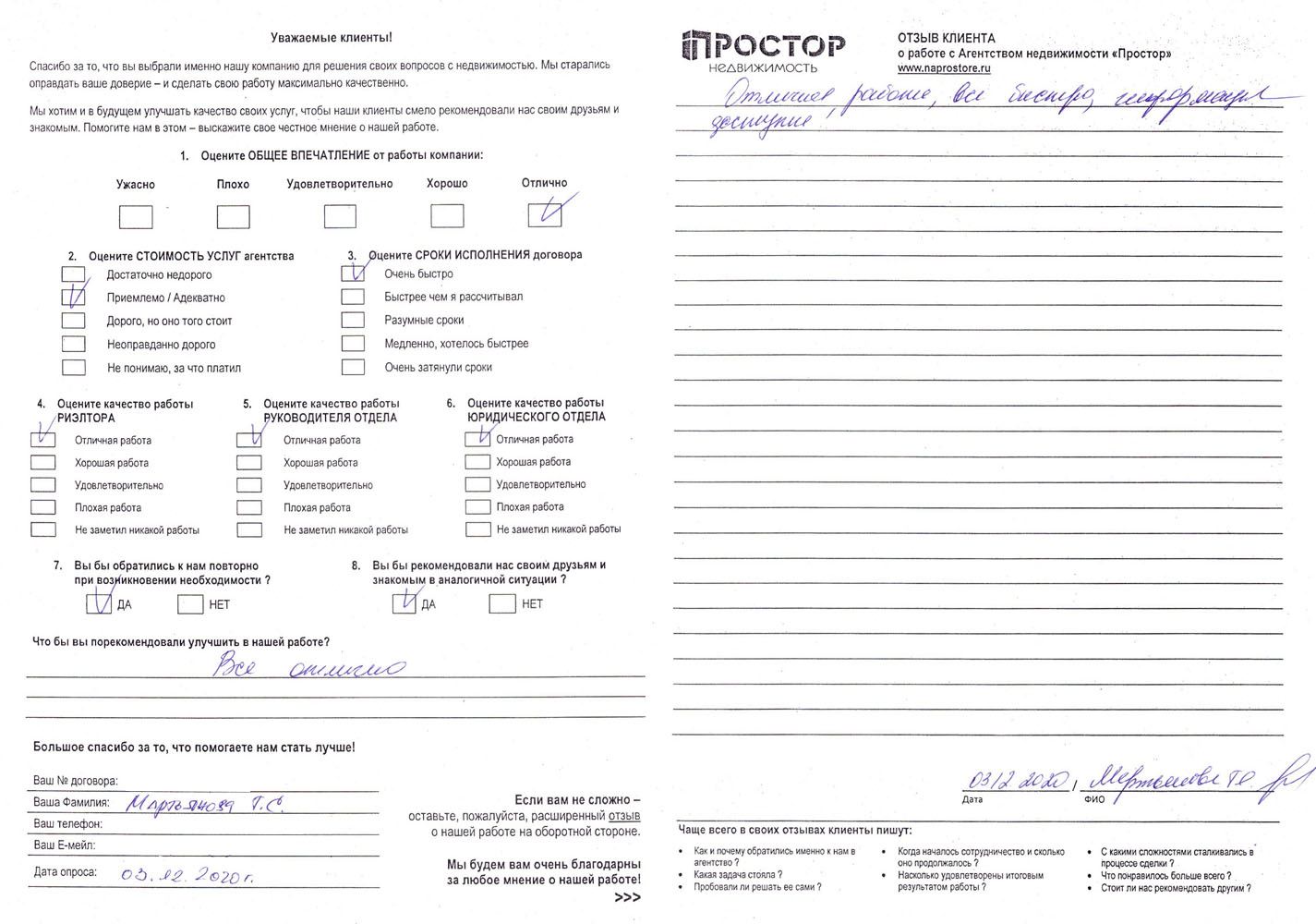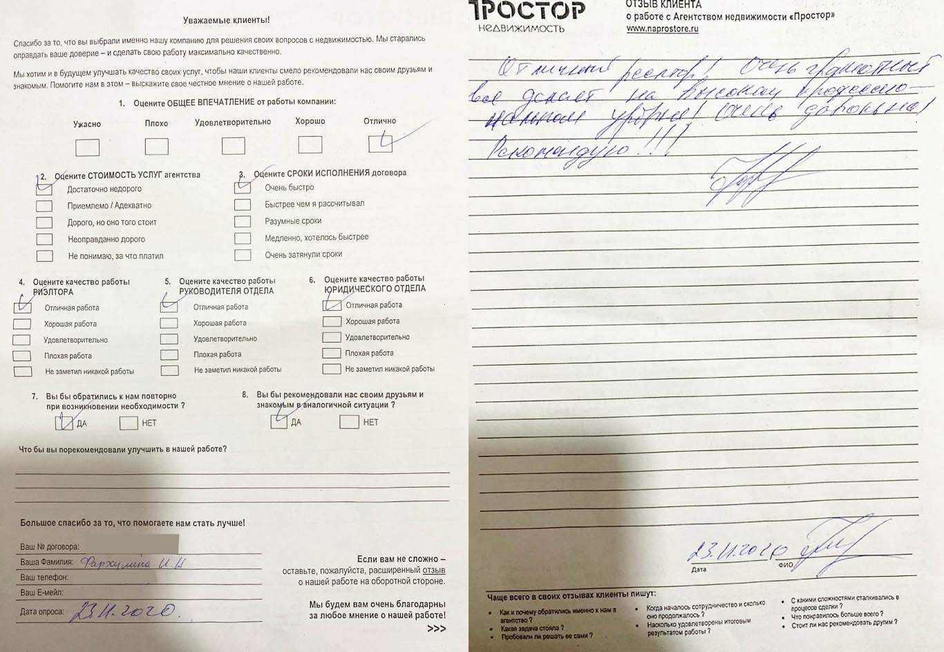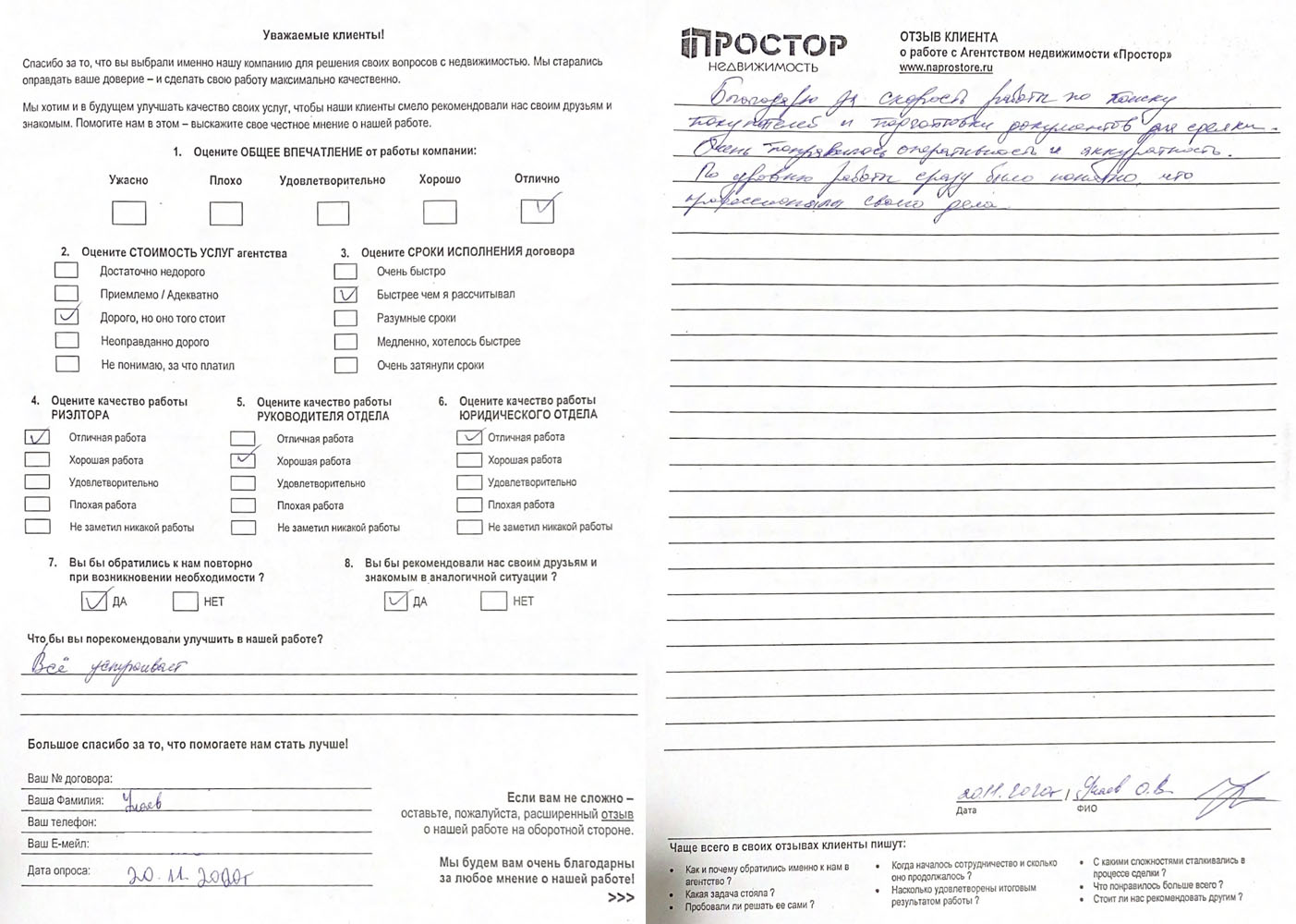 Повторно обратился к АН «Простор», снова все прошло хорошо и я доволен тем, как проходил весь процесс по продаже квартиры. Спасибо Ольге Меньшиковой и Юлии Рощикулиной за проведенную работу! Все прошло быстро, динамично и всегда в контакте по всем вопросам, отдельный большой плюс, что окончательная стоимость продажи получилась даже чуть больше предполагаемой сначала!