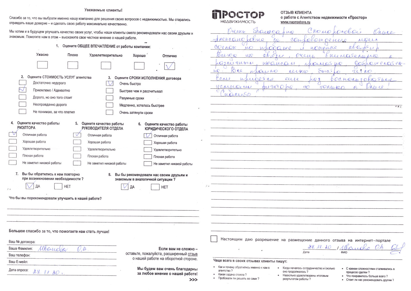 Я, Атаян Нонна Николаевна, являюсь клиентом агентства «Простор», работаем с агентом Ольгой Меньшиковой. Спасибо Вам огромное за четкую и оперативную работу. Вопрос решили четко; с оформлением справились также оперативно. Были учтены все наши пожелания и возможности. Рекомендую всем такого чуткого и отзывчивого сотрудника. Обязательно буду рекомендовать всем своим близким и знакомым. Изначально я сомневалась, что вообще это реально и возможно, так как были некоторые сложности с нашей стороны, а Ольга все так четко и конструктивно объяснила, а также просто вселила надежду, и всё получилось, в общем сделала невозможное возможным. Спасибо Вам огромное!!!