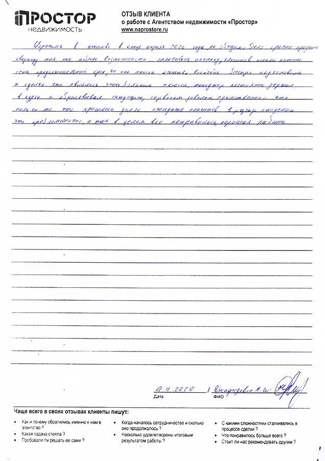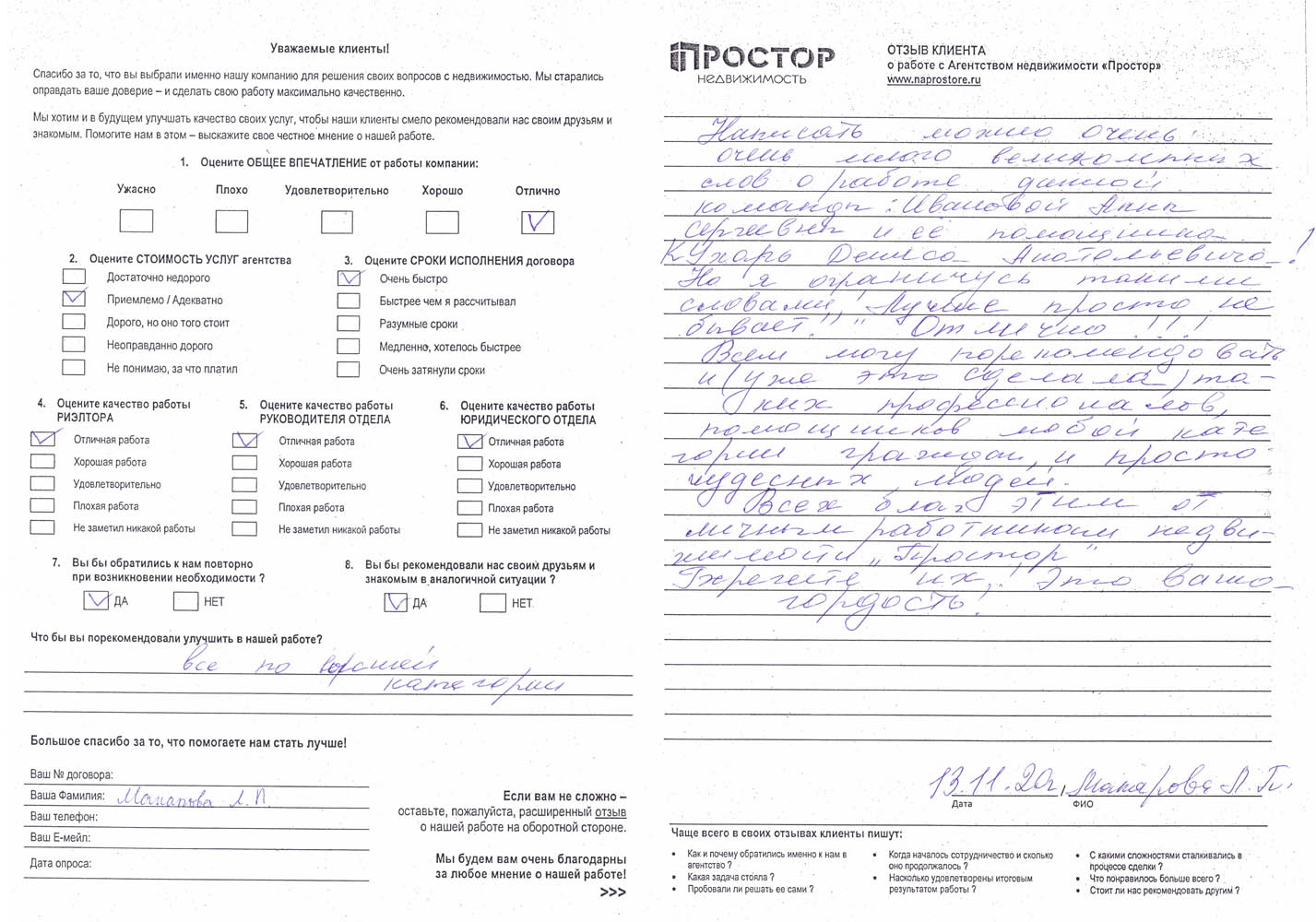 Я, Атаян Нонна Николаевна, являюсь клиентом агентства «Простор», работаем с агентом Ольгой Меньшиковой. Спасибо Вам огромное за четкую и оперативную работу. Вопрос решили четко; с оформлением справились также оперативно. Были учтены все наши пожелания и возможности. Рекомендую всем такого чуткого и отзывчивого сотрудника. Обязательно буду рекомендовать всем своим близким и знакомым. Изначально я сомневалась, что вообще это реально и возможно, так как были некоторые сложности с нашей стороны, а Ольга все так четко и конструктивно объяснила, а также просто вселила надежду, и всё получилось, в общем сделала невозможное возможным. Спасибо Вам огромное!!!