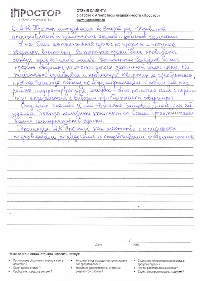 С АН Простор сотрудничаем во второй раз. Нравится оперативность и грамотность агентов и юристов компании. У нас была альтернативная сделка по продаже и покупке квартиры в ипотеку. В короткие сроки были проведены показы продаваемого жилья. Константин Самбулов помог продать квартиру на 250 дороже заявленной нами цены. Он тщательно организовал и просмотры квартир на приобретение, проведя большую работу по сбору информации о новом для нас районе, инфраструктуре, соседях - это помогло нам с первого раза определиться с выбором приобретаемой квартиры. Отдельное спасибо Юлии Евгеньевне Зайцевой, благодаря ей удалось быстро наладить контакт со всеми участниками нашей альтернативной сделки. Рекомендую АН Простор, как агентство с юридически подкованными, порядочными и отзывчивыми специалистами.