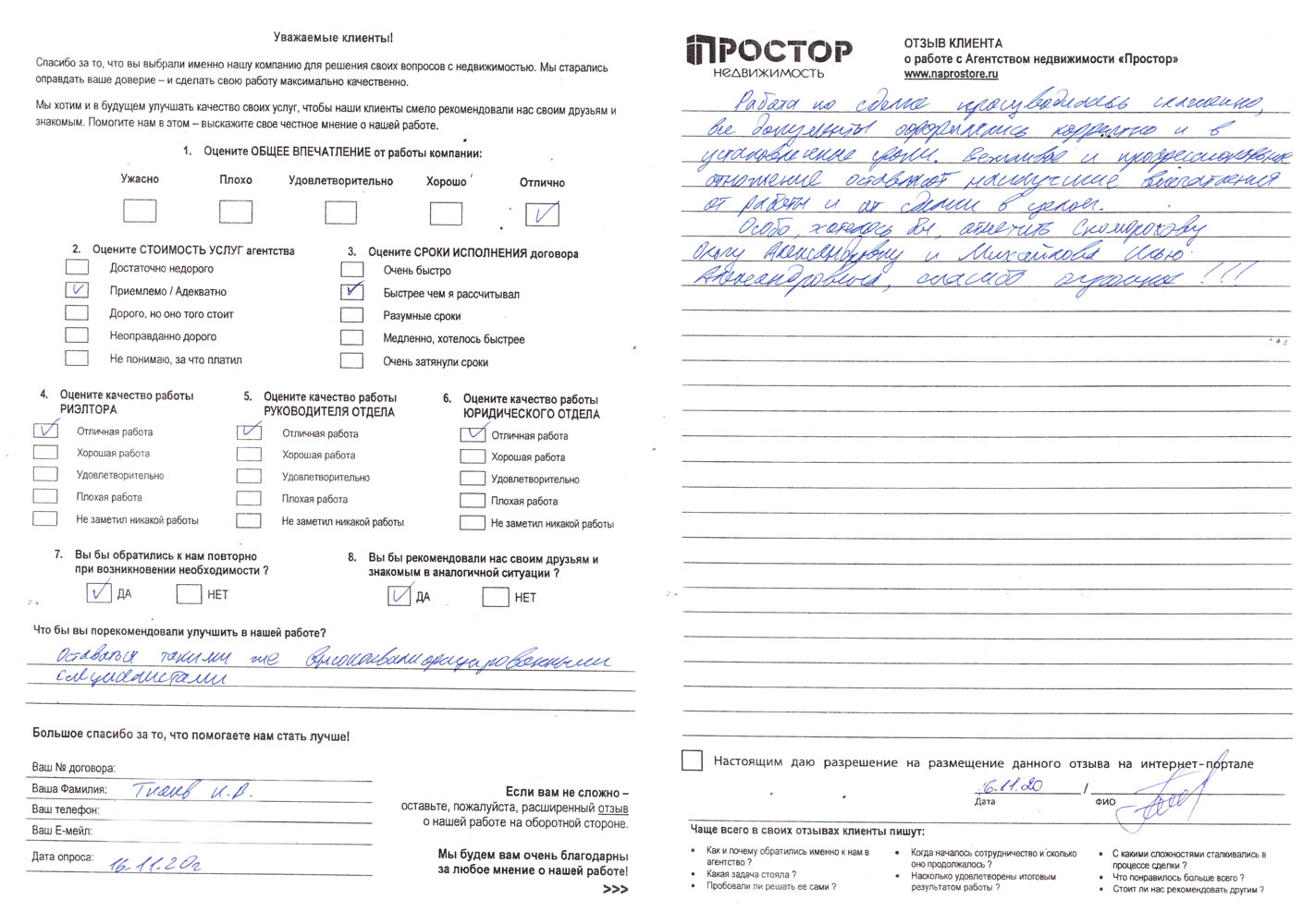 Повторно обратился к АН «Простор», снова все прошло хорошо и я доволен тем, как проходил весь процесс по продаже квартиры. Спасибо Ольге Меньшиковой и Юлии Рощикулиной за проведенную работу! Все прошло быстро, динамично и всегда в контакте по всем вопросам, отдельный большой плюс, что окончательная стоимость продажи получилась даже чуть больше предполагаемой сначала!