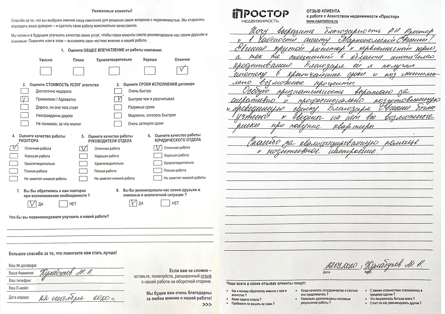 Повторно обратился к АН «Простор», снова все прошло хорошо и я доволен тем, как проходил весь процесс по продаже квартиры. Спасибо Ольге Меньшиковой и Юлии Рощикулиной за проведенную работу! Все прошло быстро, динамично и всегда в контакте по всем вопросам, отдельный большой плюс, что окончательная стоимость продажи получилась даже чуть больше предполагаемой сначала!