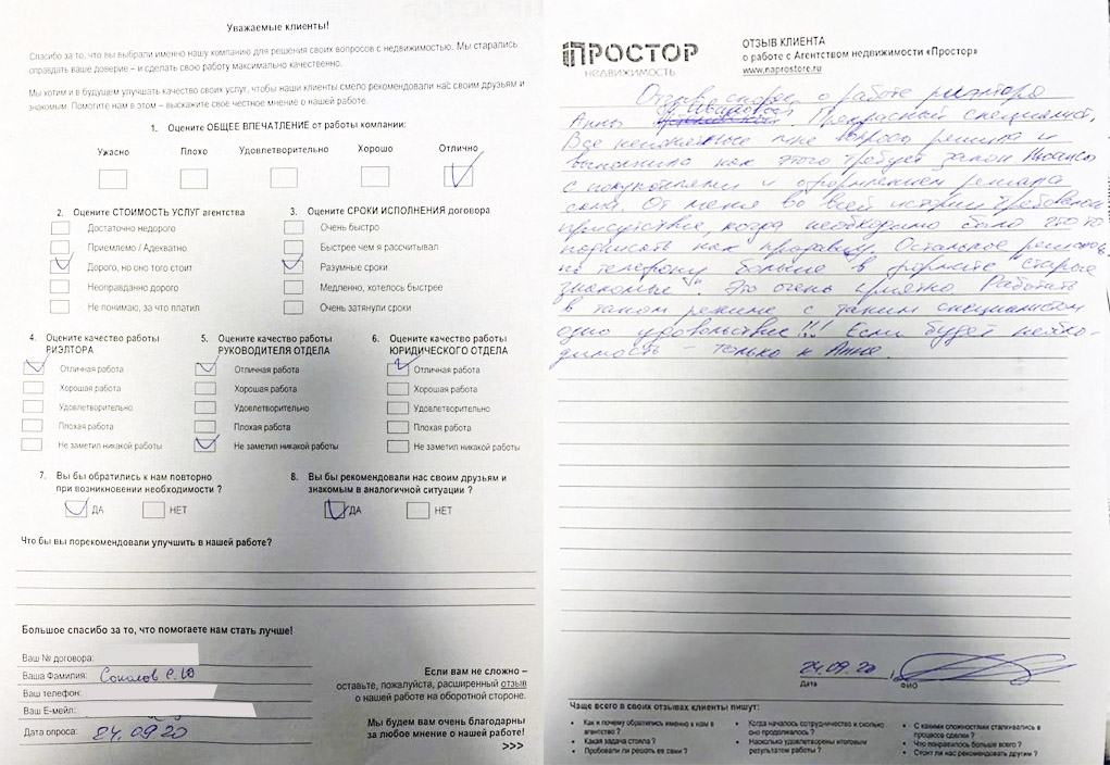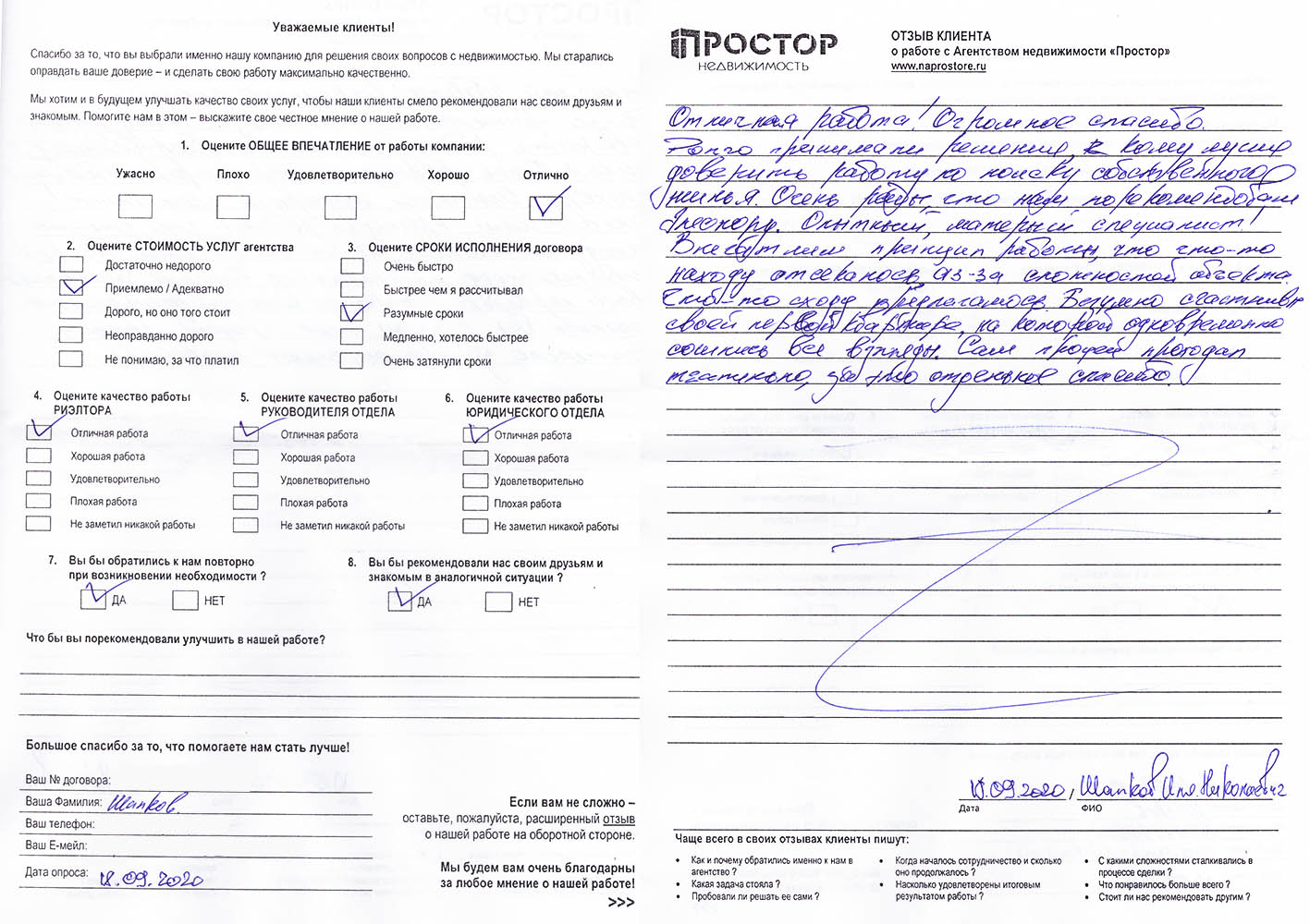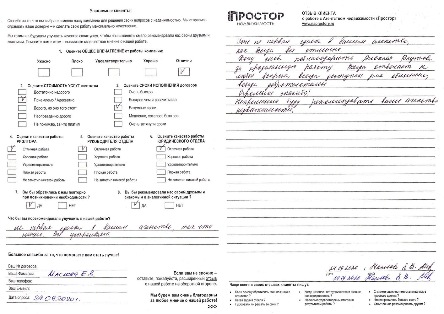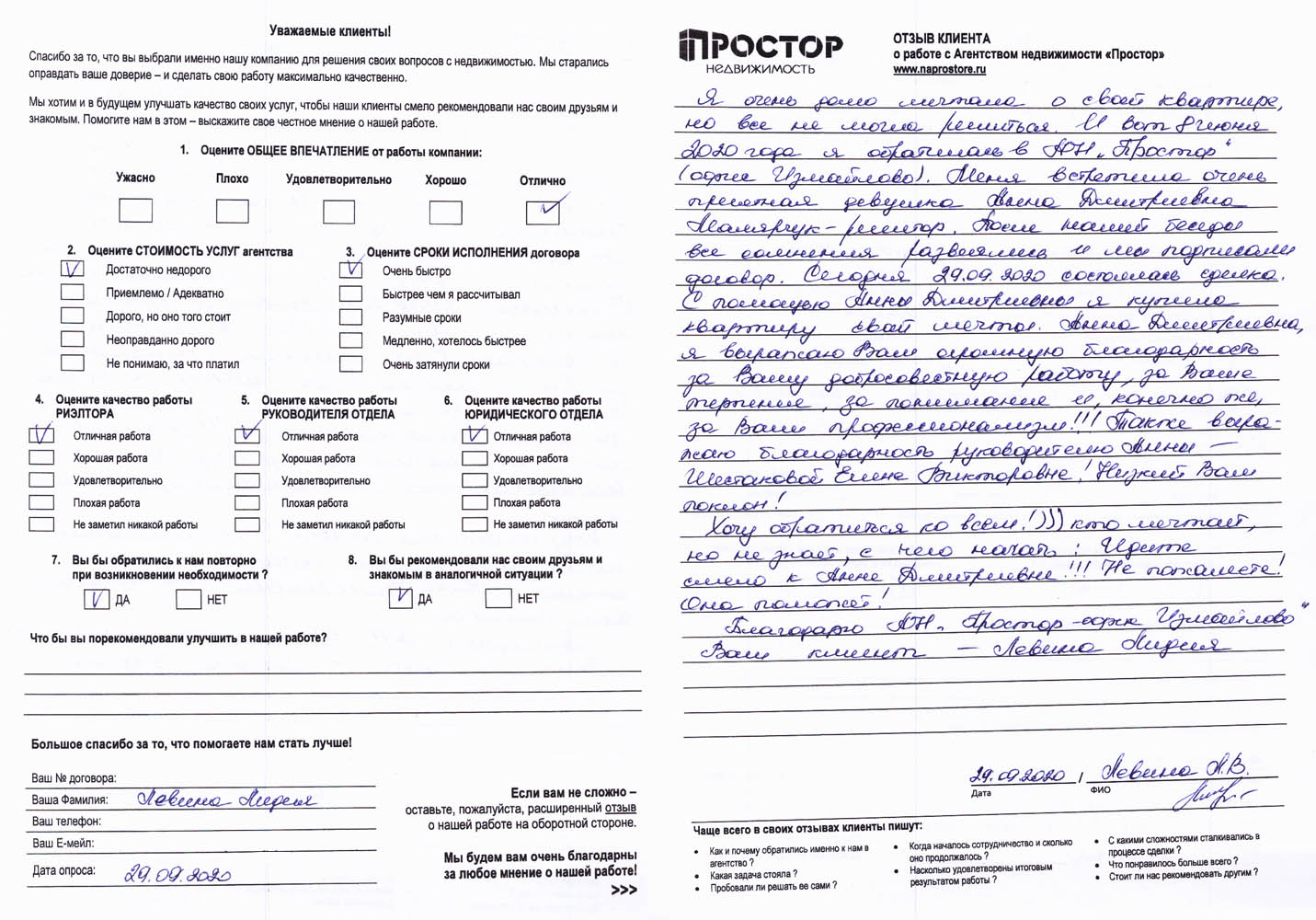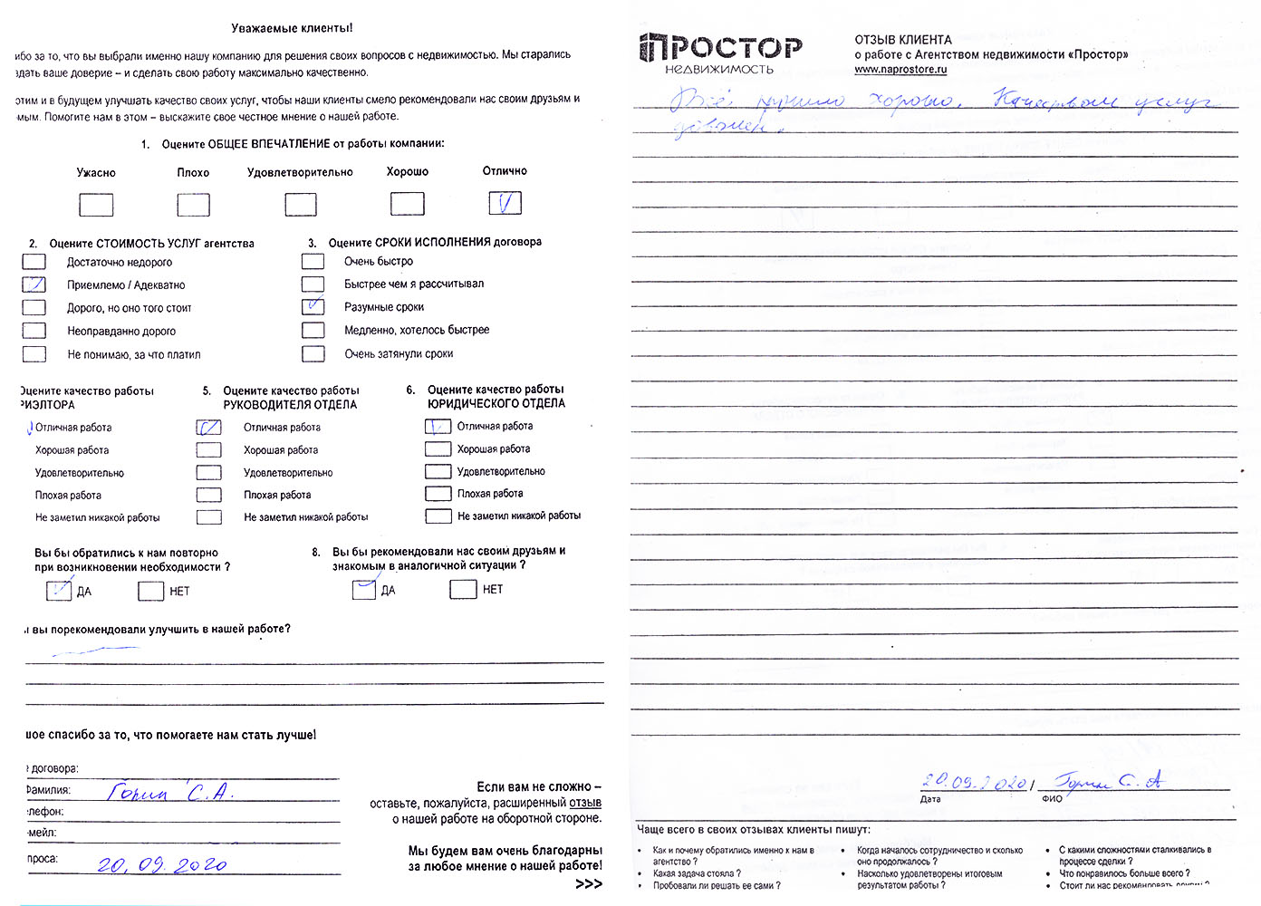 Благодарю компанию «Простор» за отличную работу в лице Абрамович О.В. за быструю продажу квартиры, поиске новой квартиры. Менеджер компании Абрамович О.В. очень грамотный, ответственный и внимательный сотрудник, я полностью доверилась этой компании и получила отличный результат: квартира продана, куплена новая квартира в желаемом районе по желаемой цене. Обязательно буду рекомендовать компанию «Простор» своим знакомым. Отдельное спасибо Щедриновой А.В. за предоставленные услуги, теплый прием в офисе, сопровождении сделок; Шестаковой Е.В. за профессиональную работу, обеспечивающую спокойствие, уверенность и беззаботность меня как клиента.