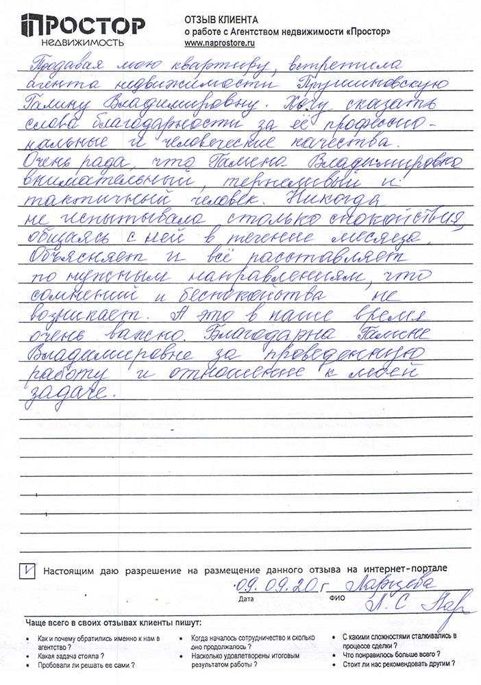 Продавая мою квартиру, встретила агента недвижимости Прушиновскую Галину Владимировну. Хочу сказать слова благодарности за ее профессиональные и человеческие качества. Очень рада, что Галина Владимировна внимательный, терпеливый и тактичный человек. Никогда не испытывала столько спокойствия, общаясь с ней в течение месяца. Объясняет и все расставляет по нужным направлениям, что сомнений и беспокойства не возникает. А это в наше время очень важно. Благодарна Галине Владимировне за проведенную работу и отношение к моей задаче