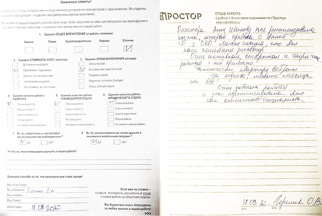 Повторно обратился к АН «Простор», снова все прошло хорошо и я доволен тем, как проходил весь процесс по продаже квартиры. Спасибо Ольге Меньшиковой и Юлии Рощикулиной за проведенную работу! Все прошло быстро, динамично и всегда в контакте по всем вопросам, отдельный большой плюс, что окончательная стоимость продажи получилась даже чуть больше предполагаемой сначала!