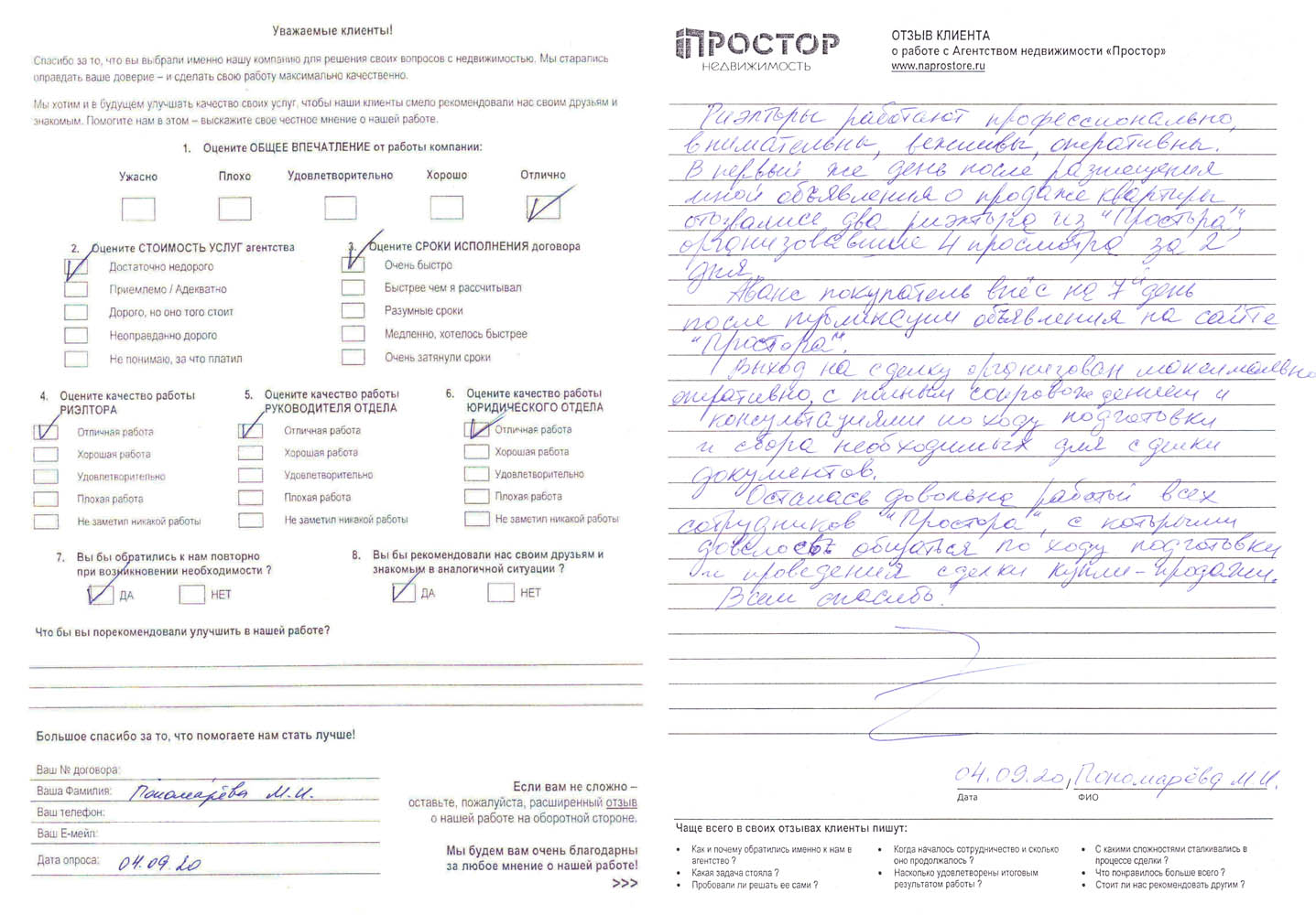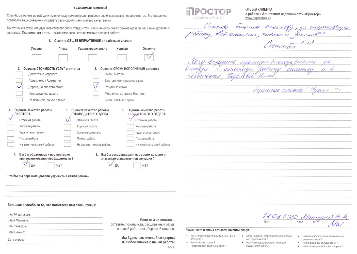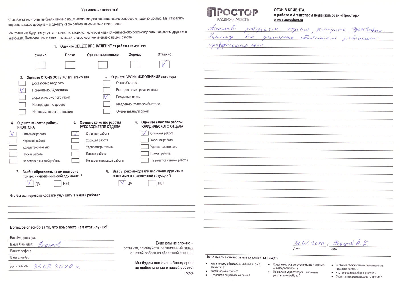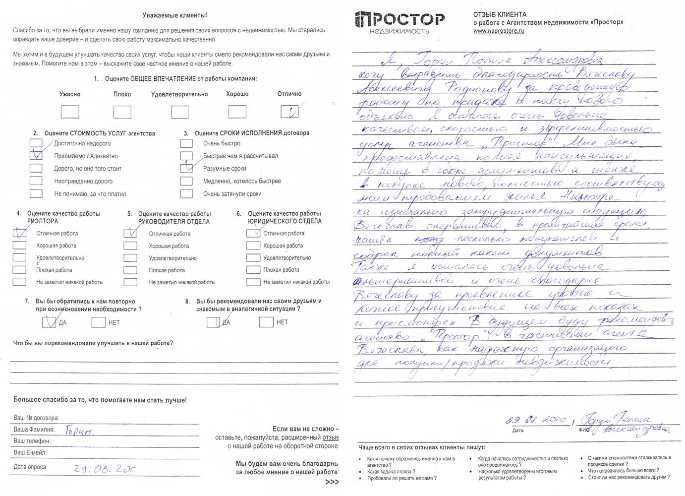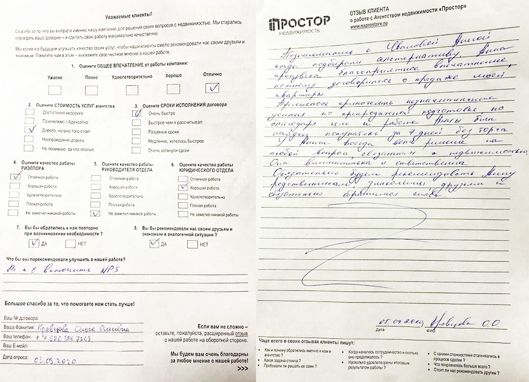 Повторно обратился к АН «Простор», снова все прошло хорошо и я доволен тем, как проходил весь процесс по продаже квартиры. Спасибо Ольге Меньшиковой и Юлии Рощикулиной за проведенную работу! Все прошло быстро, динамично и всегда в контакте по всем вопросам, отдельный большой плюс, что окончательная стоимость продажи получилась даже чуть больше предполагаемой сначала!