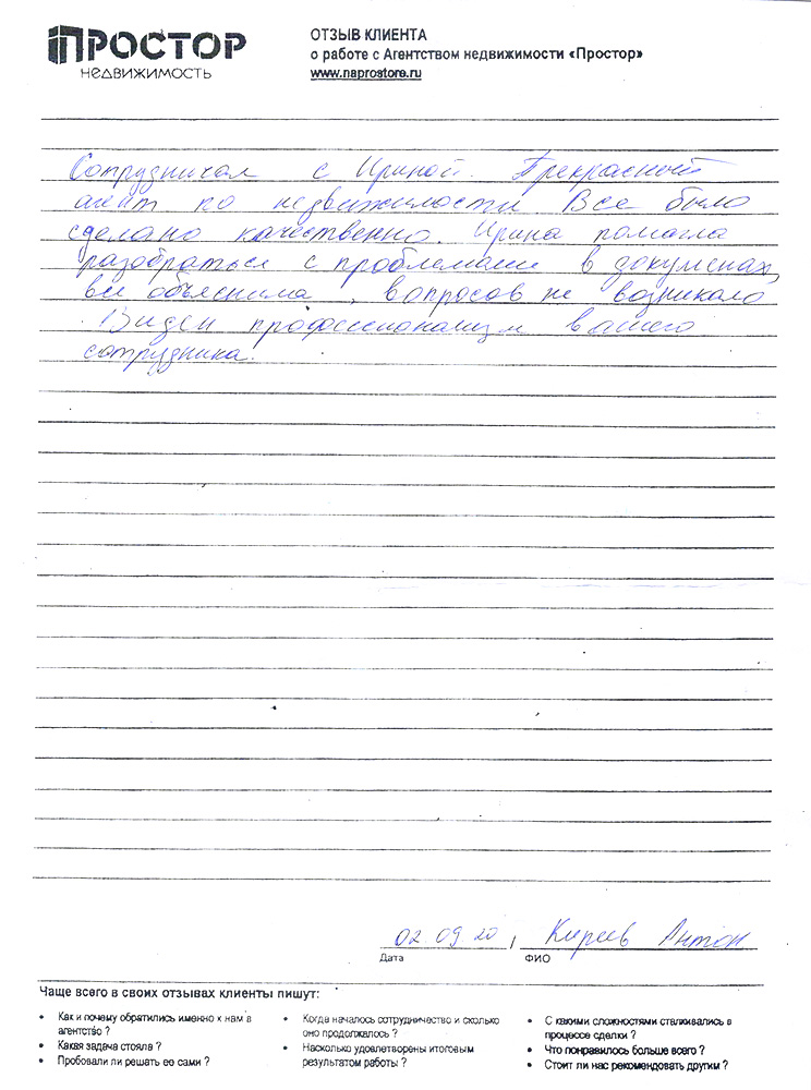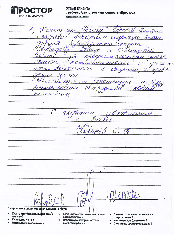 Я, клиент а/н "Простор" Королев Дмитрий Андреевич выражаю глубокую благодарность руководителю отдела Давыдову Денису и Ланцевой Ирине за профессионализм деятельности, компетентность и грамотность, тактичность в общении и проведении сделки. Настоятельно рекомендую и буду рекомендовать сотрудников новым клиентам. С глубоким уважением к Вам Королев Д.А.