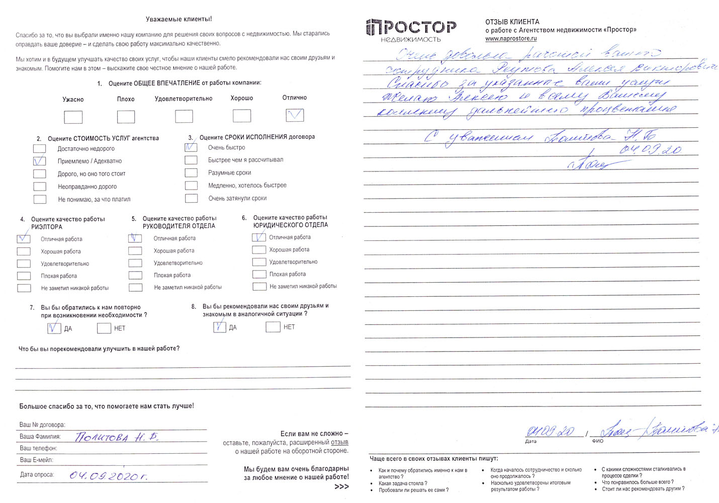 Риэлторы работают профессионально, внимательны, вежливы, оперативны. В первый же день после размещения мной объявления о продаже квартиры, отозвались два риэлтора из "Простора", организовавшие 4 просмотра за 2 дня. Аванс покупатель внес на 7 день после публикации объявления на сайте "Простора". Выход на сделку организован максимально оперативно, с полным сопровождением и консультациями по ходу подготовки и сбора необходимых для сделки документов. Осталась довольна работой всех сотрудников "Простора", с которыми довелось общаться по ходу подготовки и проведения сделки купли-продажи. Всем спасибо!