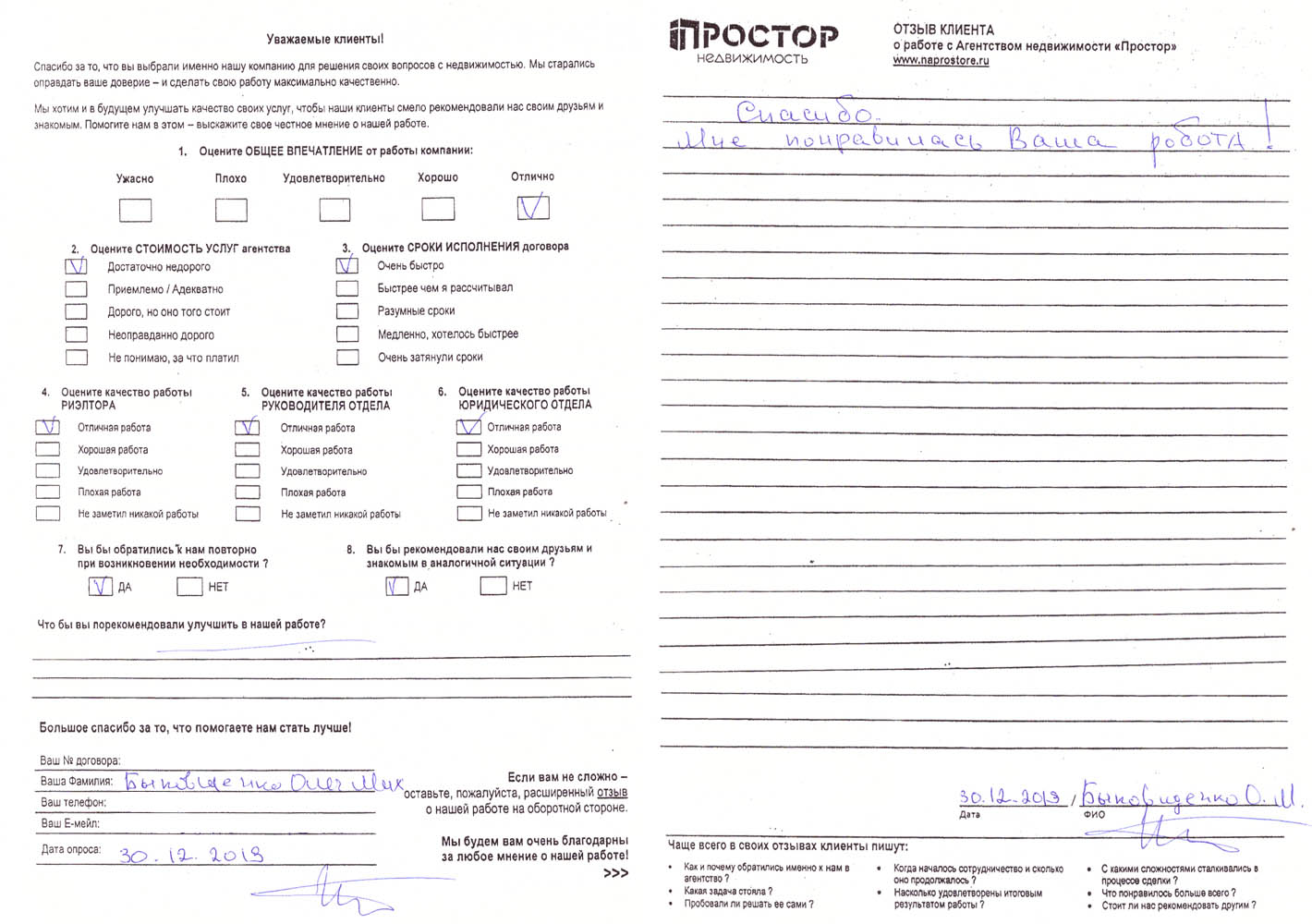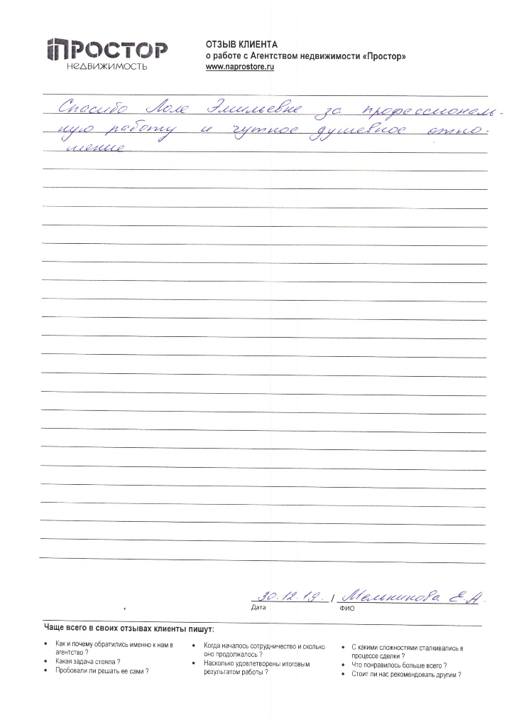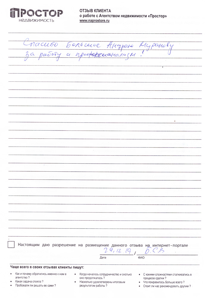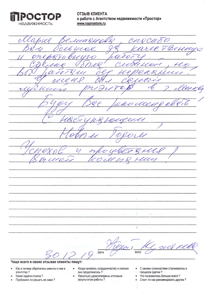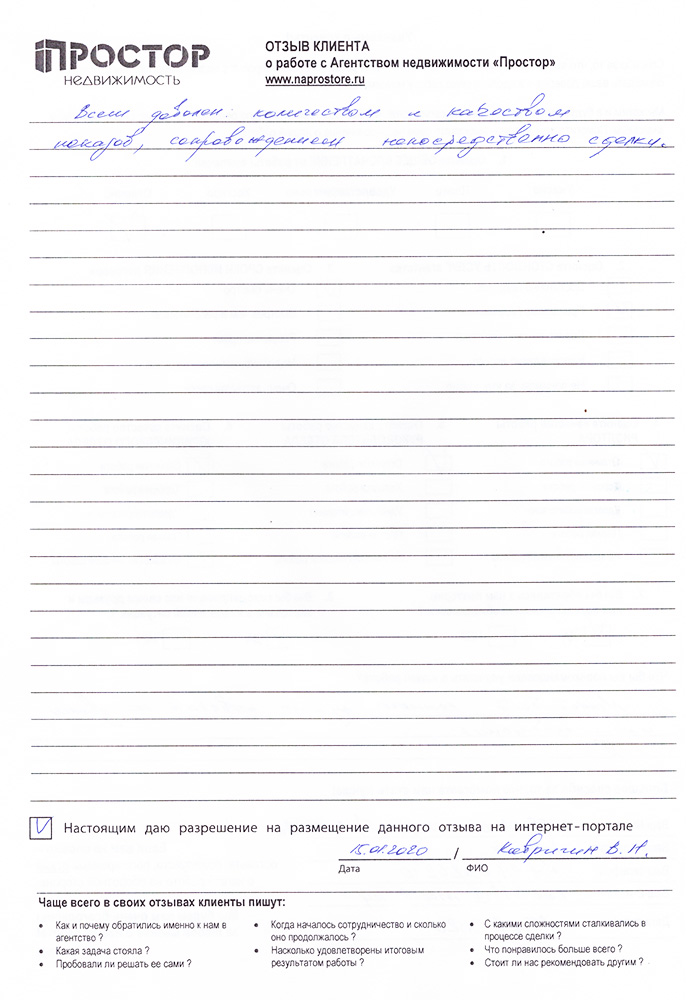 Повторно обратился к АН «Простор», снова все прошло хорошо и я доволен тем, как проходил весь процесс по продаже квартиры. Спасибо Ольге Меньшиковой и Юлии Рощикулиной за проведенную работу! Все прошло быстро, динамично и всегда в контакте по всем вопросам, отдельный большой плюс, что окончательная стоимость продажи получилась даже чуть больше предполагаемой сначала!