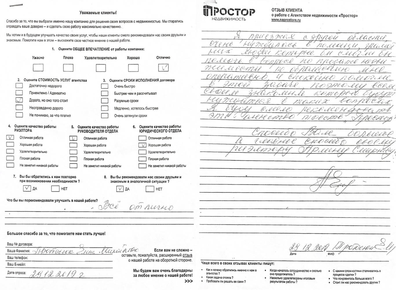 Я, приезжай с другой области, очень нуждалась в помощи грамотных людей, которые бы смогли помочь в вопросе по продаже недвижимости. По обращению мне оперативно и спокойно помогли в этой задаче, поэтому всем своим знакомым, которые будут нуждаться в таких вопросах, я буду смело рекомендовать агентство "Простор". Спасибо Вам большое, а главное спасибо своему риэлтору Армену Смирнову!!!