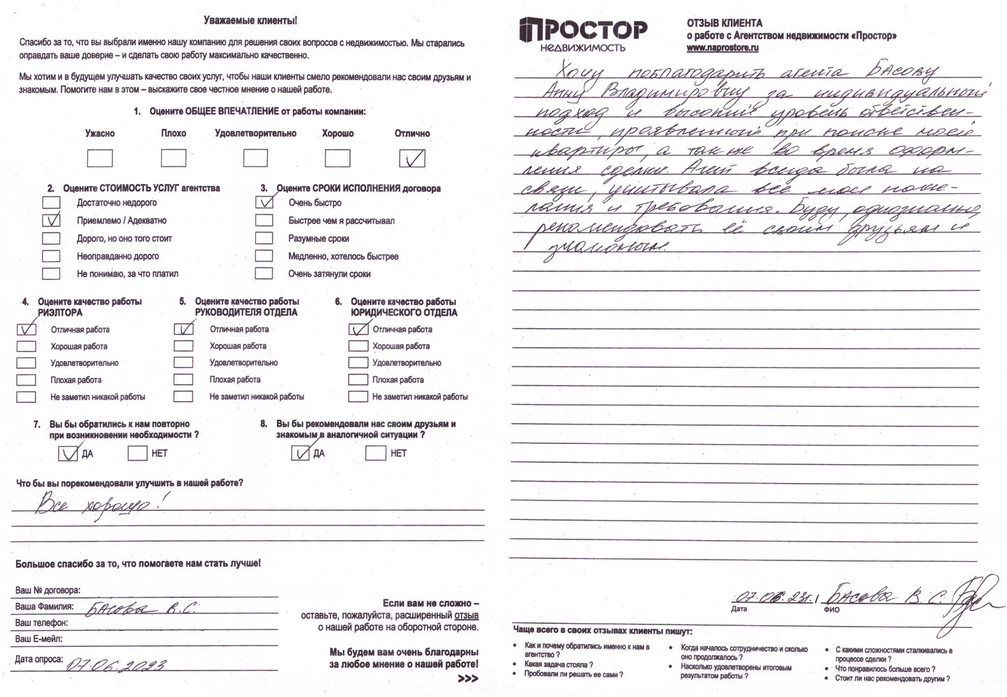 Хочу поблагодарить агента Басову Анну Владимировну за индивидуальный подход и высокий уровень ответственности, проявленный при поиске моей квартиры, а также во время оформления сделки. Агент всегда была на связи, учитывала все мои пожелания и требования. Буду, однозначно, рекомендовать ее своим друзьям и знакомым.