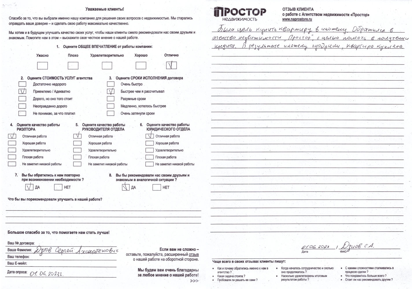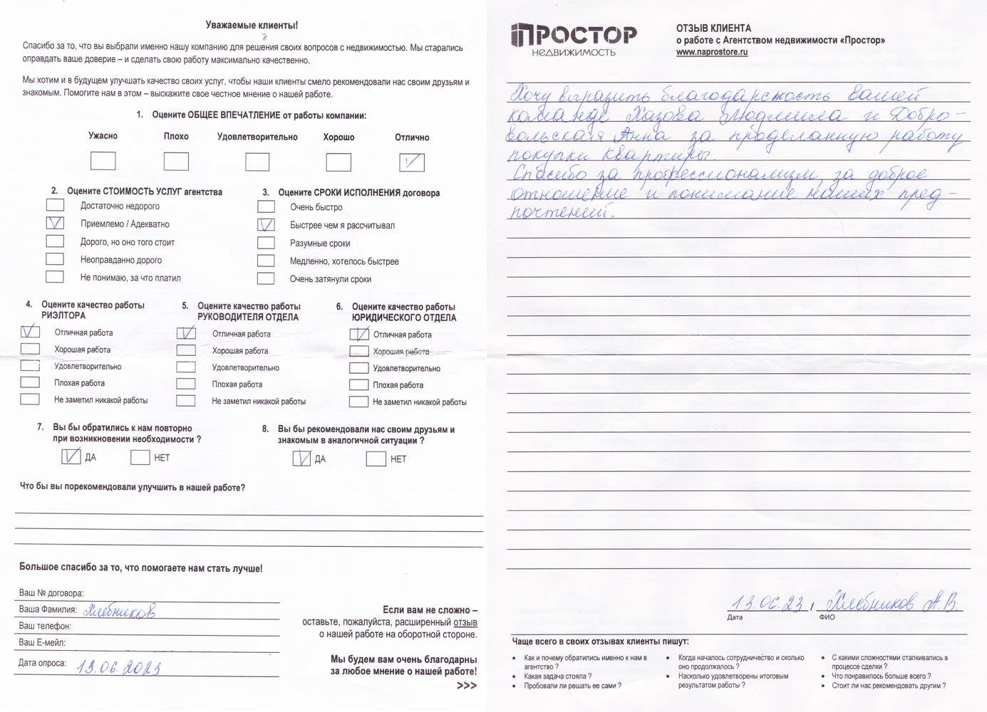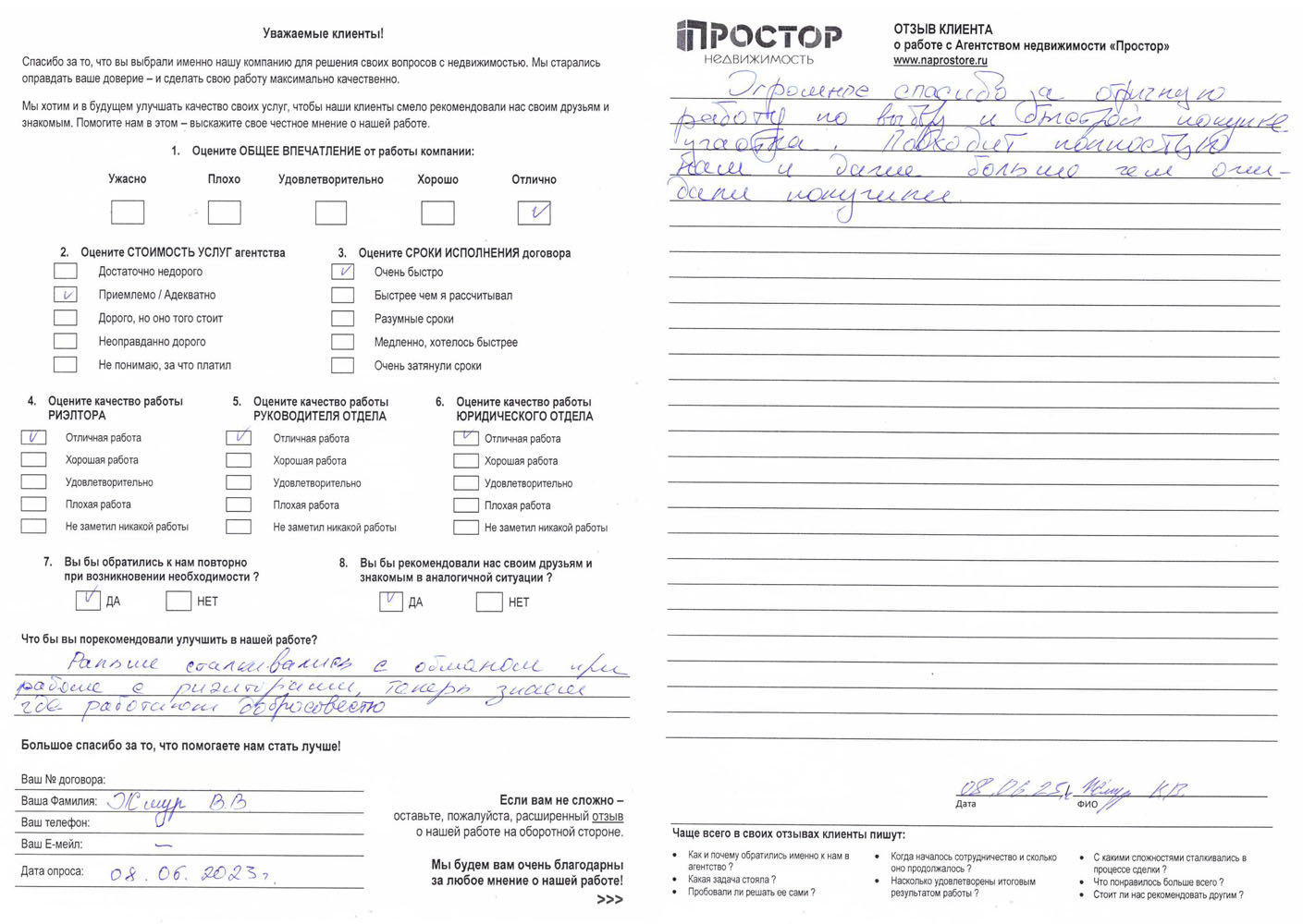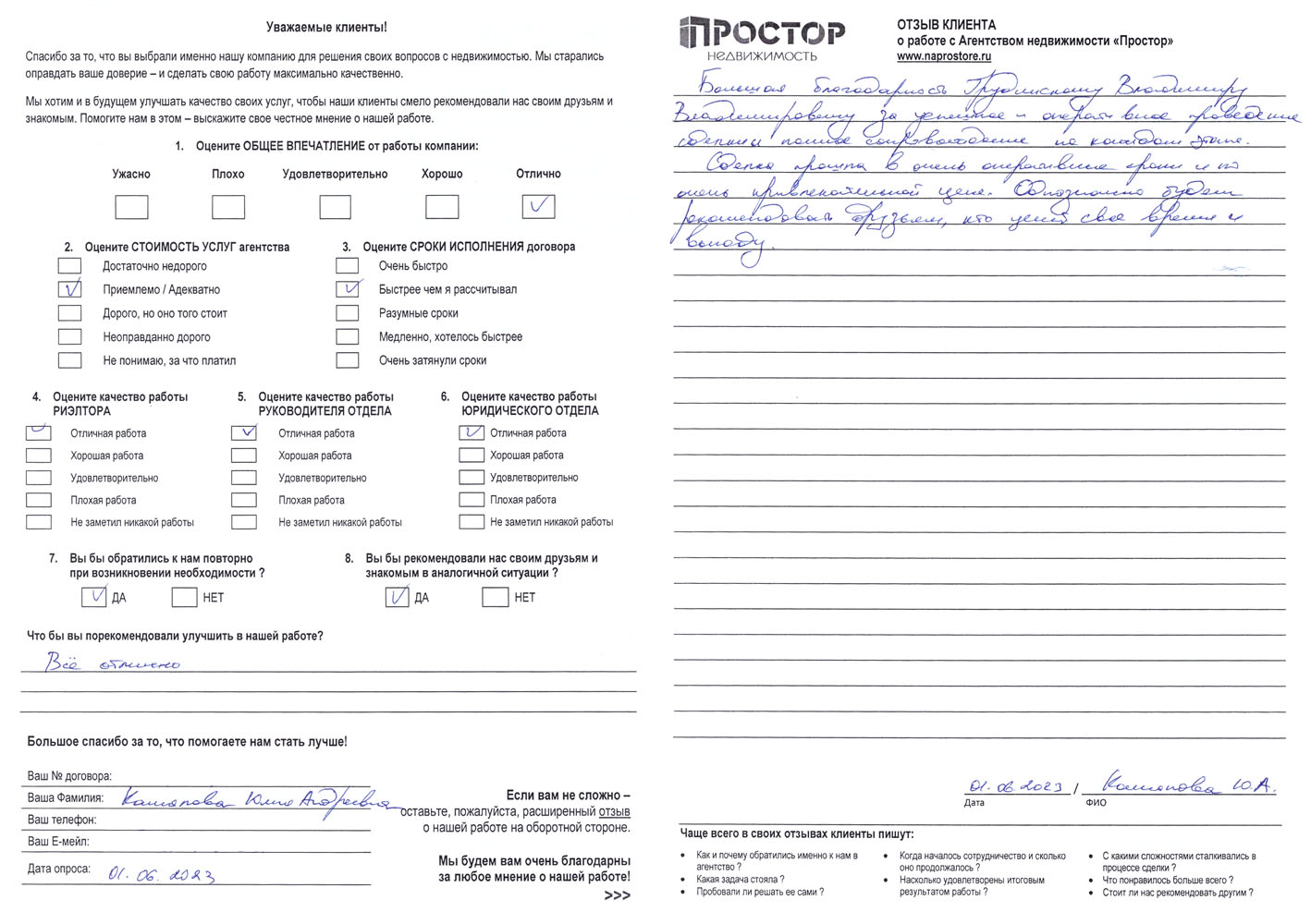 Повторно обратился к АН «Простор», снова все прошло хорошо и я доволен тем, как проходил весь процесс по продаже квартиры. Спасибо Ольге Меньшиковой и Юлии Рощикулиной за проведенную работу! Все прошло быстро, динамично и всегда в контакте по всем вопросам, отдельный большой плюс, что окончательная стоимость продажи получилась даже чуть больше предполагаемой сначала!