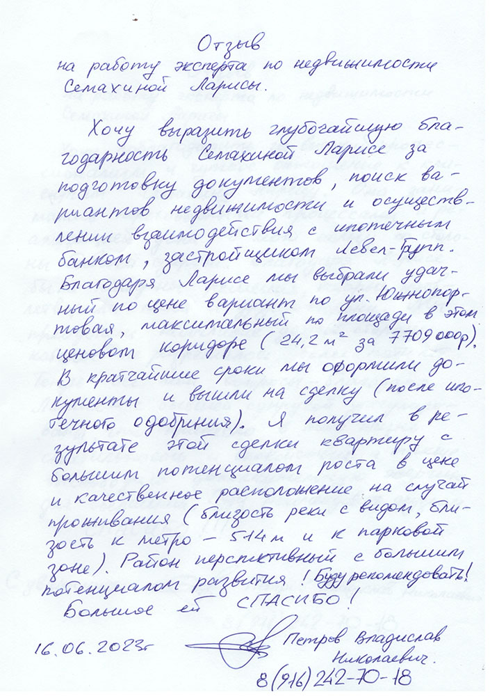 Хочу выразить глубочайшую благодарность Семахиной Ларисе за подготовку документов, поиск вариантов недвижимости и осуществление взаимодействия с ипотечным банком, застройщиком Левел-Групп. Благодаря Ларисе мы выбрали удачный по цене вариант по ул. Южнопортовая, максимальный по площади в этом ценовом коридоре ( 24.2.м.кв. за 7 709 000р). В кратчайшие сроки мы оформили документы и вышли на сделку ( после ипотечного одобрения). Я получил в результате этой сделки квартиру с большим потенциалом роста в цене и качественное расположение на случай проживания ( близость реки с видом, близость к метро - 514 м. и к парковой зоне). Район перспективный с большим потенциалом развития! Буду рекомендовать! Большое ей СПАСИБО!