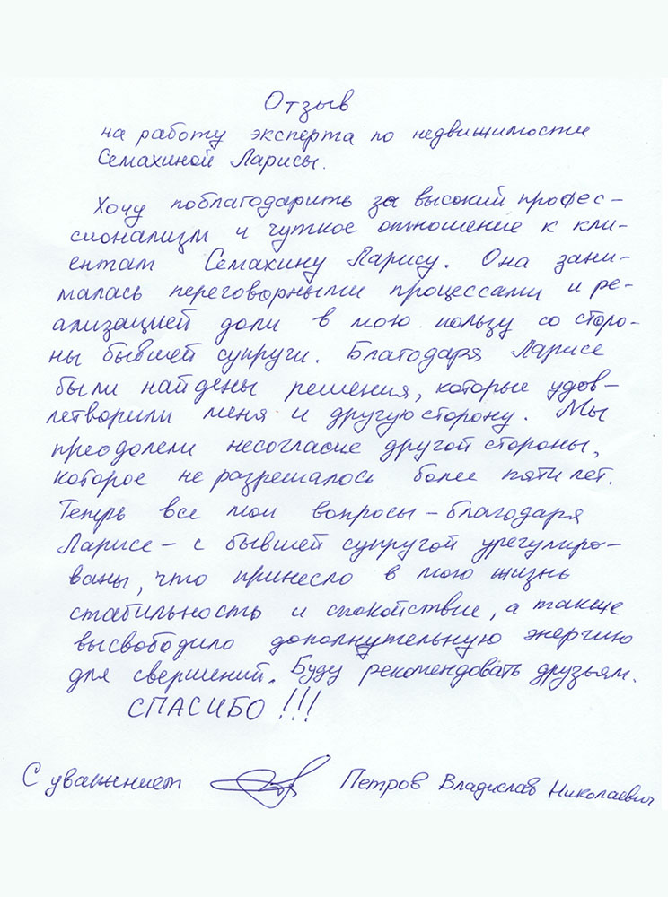 Хочу поблагодарить за высокий профессионализм и чуткое отношение к клиентам Семахину Ларису. Она занималась переговорными процессами и реализацией доли в мою пользу со стороны бывшей супруги. Благодаря Ларисе были найдены решения, которые удовлетворили меня и другую сторону. Мы преодолели несогласие другой стороны, которое не разрешалось более пяти лет. Теперь все мои вопросы - благодаря Ларисе- с бывшей супругой урегулированы, что принесло в мою жизнь стабильность и спокойствие, а так же высвободило дополнительную энергию для свершений. Буду рекомендовать друзьям. Спасибо !!!