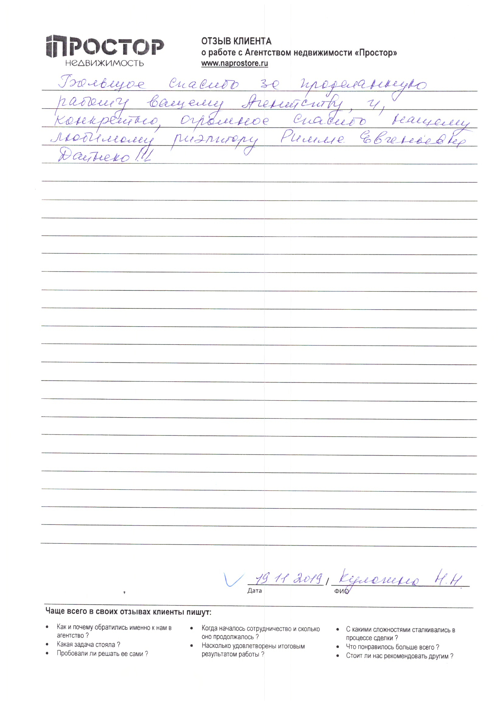 Большое спасибо за проделанную работу вашему агентству и, конкретно, огромное спасибо риэлтору Римме Евгеньевне Дайнеко!