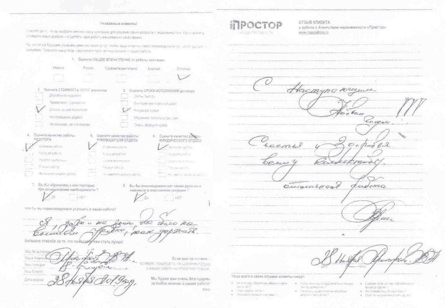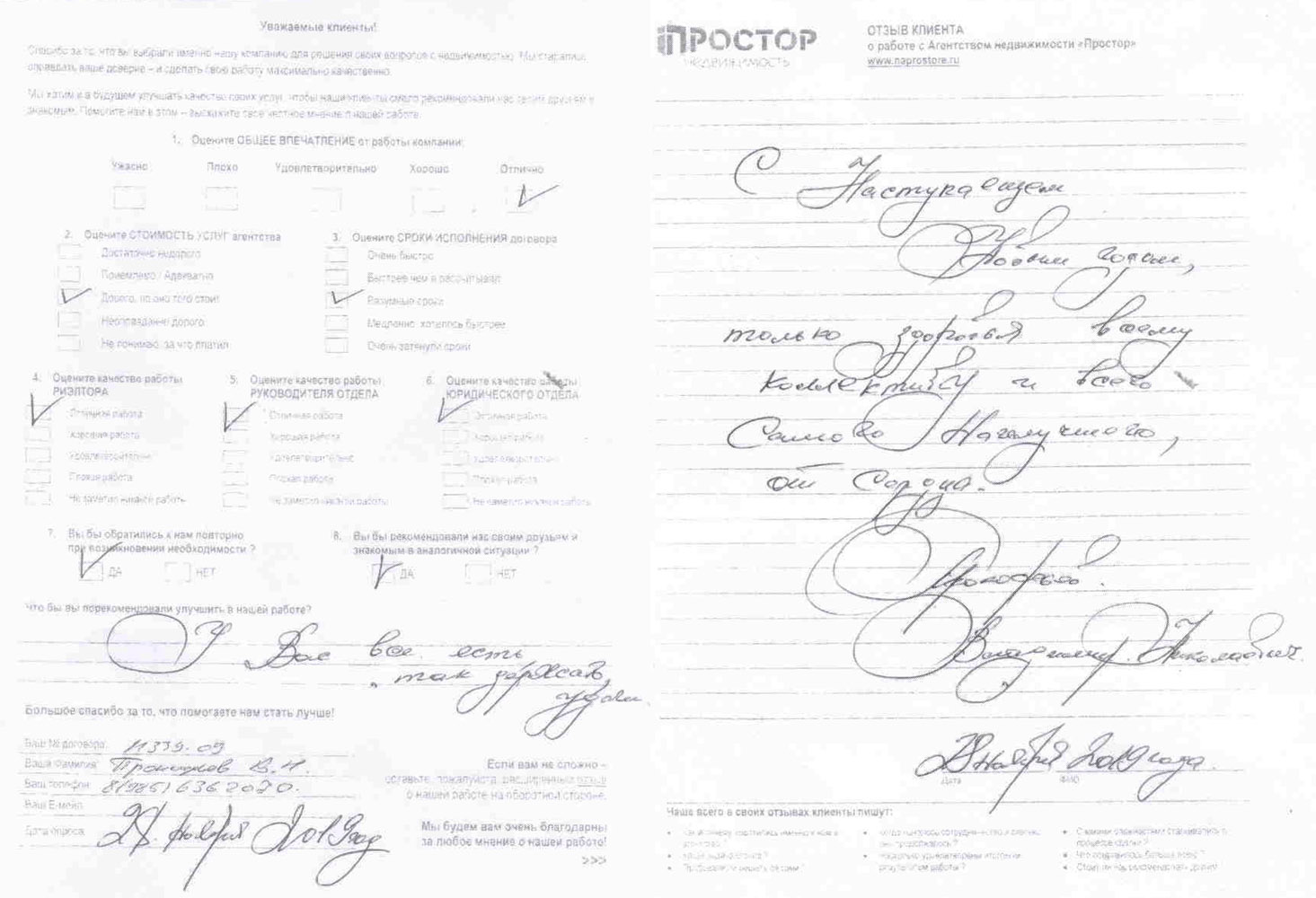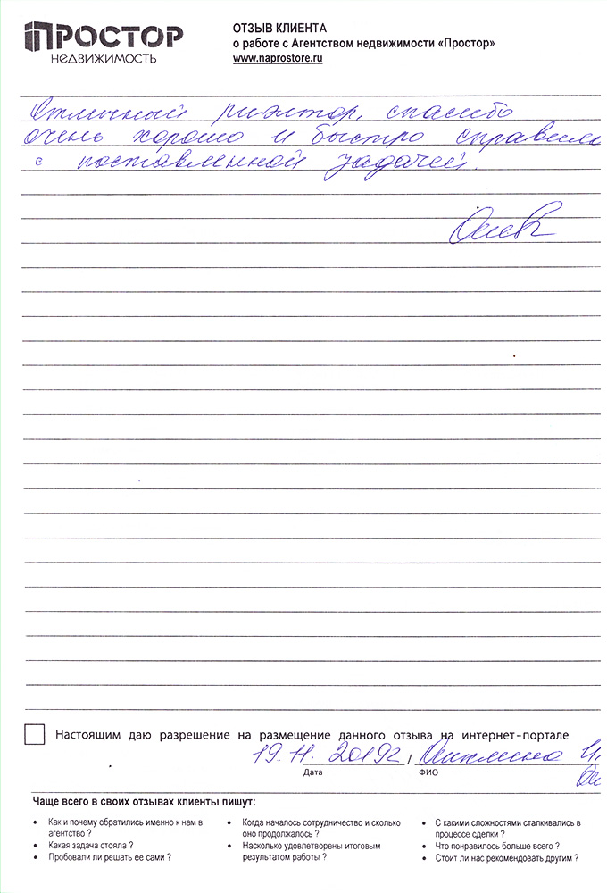 Повторно обратился к АН «Простор», снова все прошло хорошо и я доволен тем, как проходил весь процесс по продаже квартиры. Спасибо Ольге Меньшиковой и Юлии Рощикулиной за проведенную работу! Все прошло быстро, динамично и всегда в контакте по всем вопросам, отдельный большой плюс, что окончательная стоимость продажи получилась даже чуть больше предполагаемой сначала!