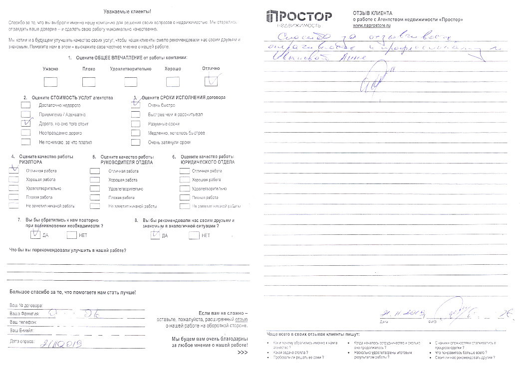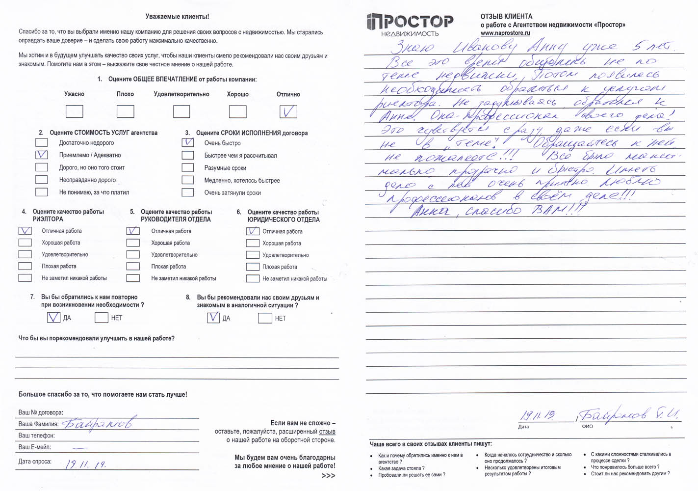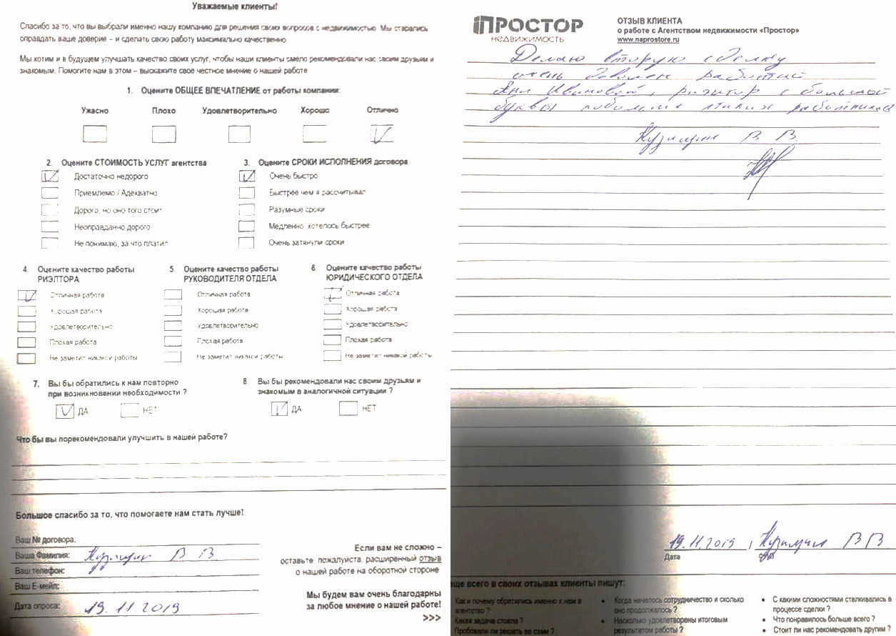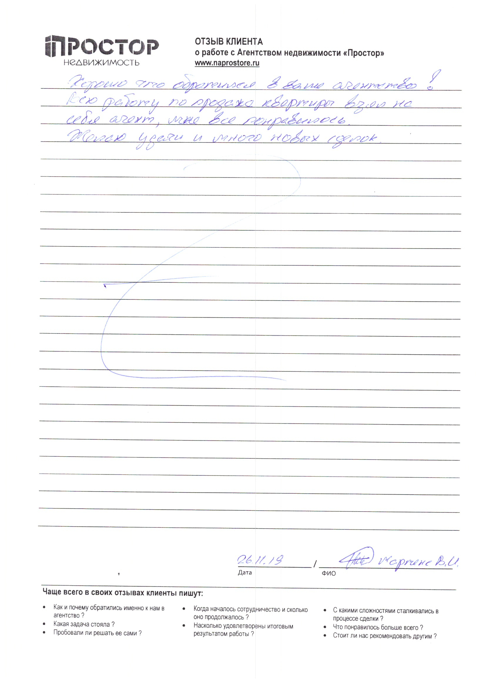 Повторно обратился к АН «Простор», снова все прошло хорошо и я доволен тем, как проходил весь процесс по продаже квартиры. Спасибо Ольге Меньшиковой и Юлии Рощикулиной за проведенную работу! Все прошло быстро, динамично и всегда в контакте по всем вопросам, отдельный большой плюс, что окончательная стоимость продажи получилась даже чуть больше предполагаемой сначала!