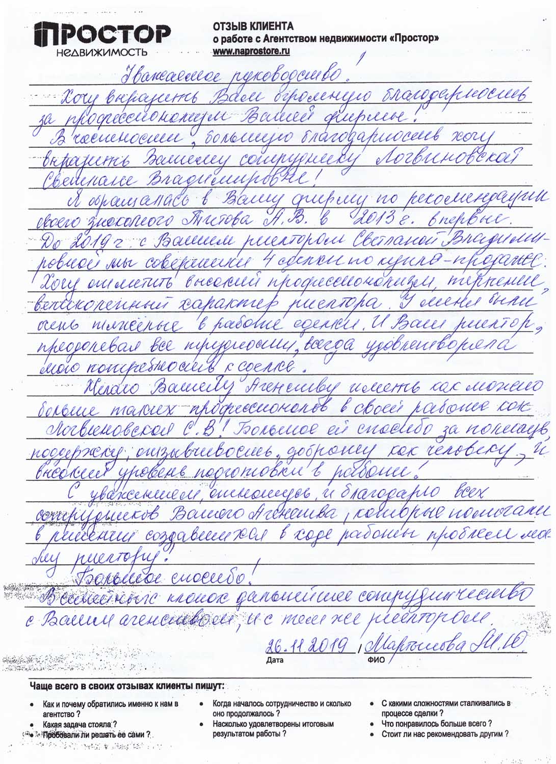 Уважаемое руководство! Хочу выразить Вам огромную благодарность за профессионализм Вашей фирмы. В частности большую благодарность хочу выразить Вашему сотруднику, Логвиновской.С.В! Хочу отметить высокий профессионализм, терпение, великолепный характер. Желаю Вашему агенству иметь как можно больше таких профессионалов в своей работе как Логвиновская.С.В. Большое Спасибо!