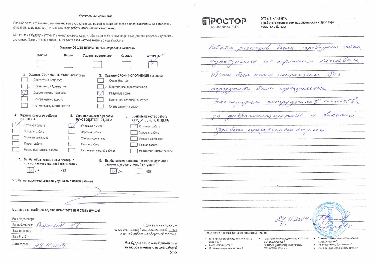 По рекомендации обратился в агентство недвижимости "Простор" с целью продажи квартиры в МО. Хочу поблагодарить сотрудников агентства Маркопольскую Евгению и Рыскину Надежду за отличную организацию процесса.