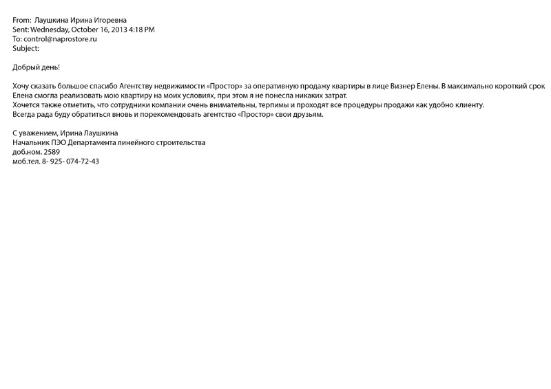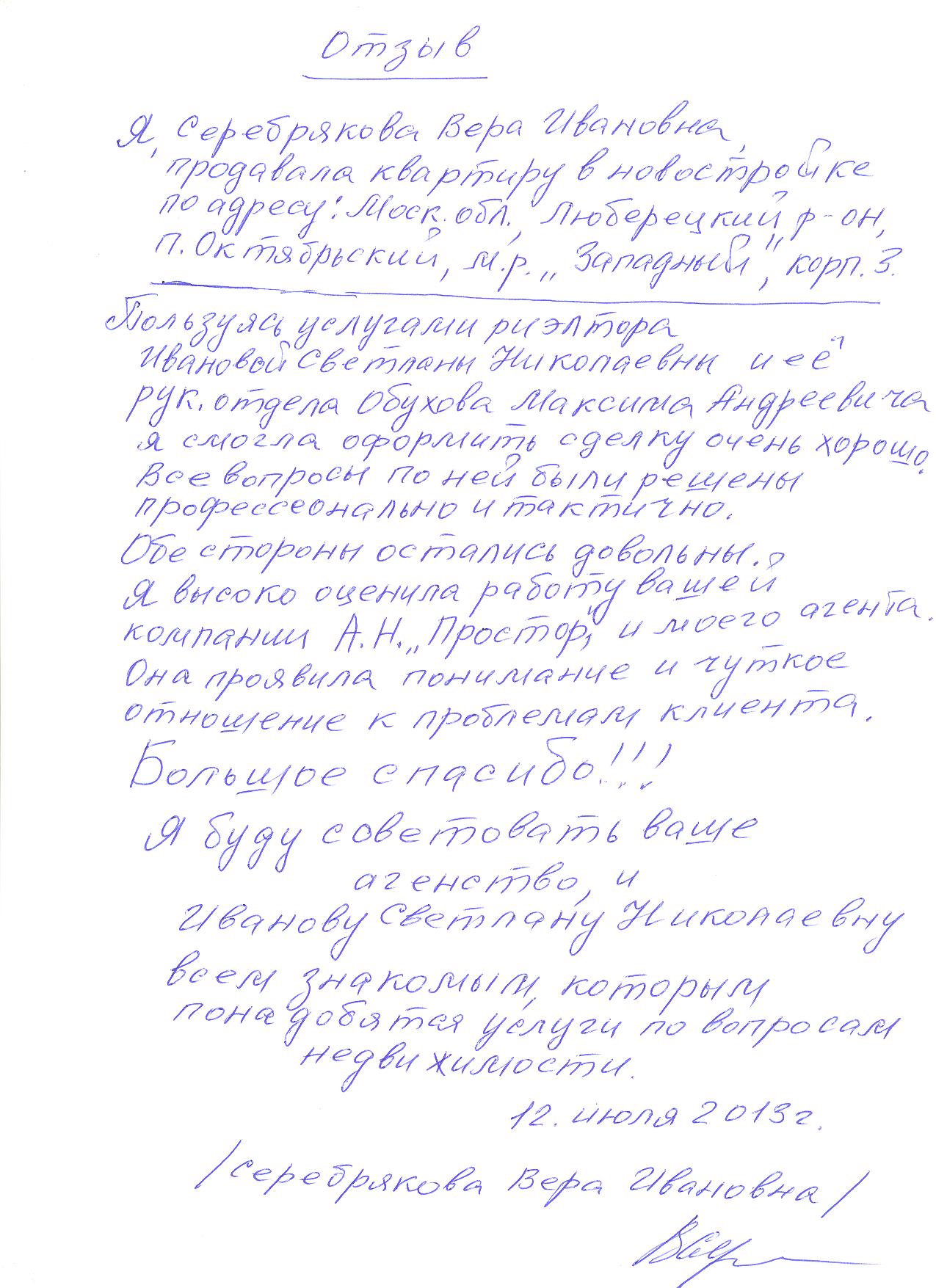 Я, Серебрякова Вера Ивановна, продавала квартиру в новостройке по адресу: МО, Люберецкий район, пос. октябрьский, мкрн. Западный, корп. 3. Пользуясь услугами риэлтора Ивановой Светланы Николаевны и ее руководителя Обухова Максима Андреевича я смогла оформить сделку очень хорошо. Все вопросы по ней были решены профессионально и тактично. Обе стороны остались довольны. Я высоко оценила работу вашей компании АН "Простор" и моего агента. Она проявила понимание и чуткое отношение к проблемам клиента. Большое спасибо!!! Я буду советовать ваше агентство и Иванову Светлану Николаевну всем знакомым, которым понадобятся услуги по вопросам недвижимости.
