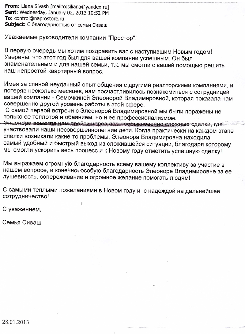 В первую очередь мы хотим поздравить вас с наступившим Новым годом! Уверены, что этот год был успешным для вашей компании. Он был знаменательным и для нашей семьи, т.к. мы смогли с вашей помощью решить наш непростой квартирный вопрос. Имея за спиной неудачный опыт общения с другими риэлторскими компаниями, и потеряв несколько месяцев, нам посчастливилось познакомиться с сотрудницей вашей компании - Семочкиной Элеонорой Владимировной, которая показала нам совершенно другой уровень работы в этой сфере. С самой первой встречи с Элеонорой Владимировной мы были поражены не только ее теплотой и обаянием, но и ее профессионализмом. Элеонора помогла нам пройти через две необыкновенно сложные сделки, где участвовали наши несовершеннолетние дети. Когда практически на каждом этапе сделки возникали какие-то проблемы, Элеонора Владимировна находила самый удобный и быстрый выход из сложившейся ситуации, благодаря которому мы смогли ускорить весь процесс и к Новому году отметить успешную сделку! Мы выражаем огромную благодарность всему вашему коллективу за участие в нашем вопросе, и конечно, особую благодарность Элеоноре Владимировне за ее душевность, сопереживание и огромное желание помогать людям! С самыми теплыми пожеланиями в Новом году и с надеждой на дальнейшее сотрудничество!