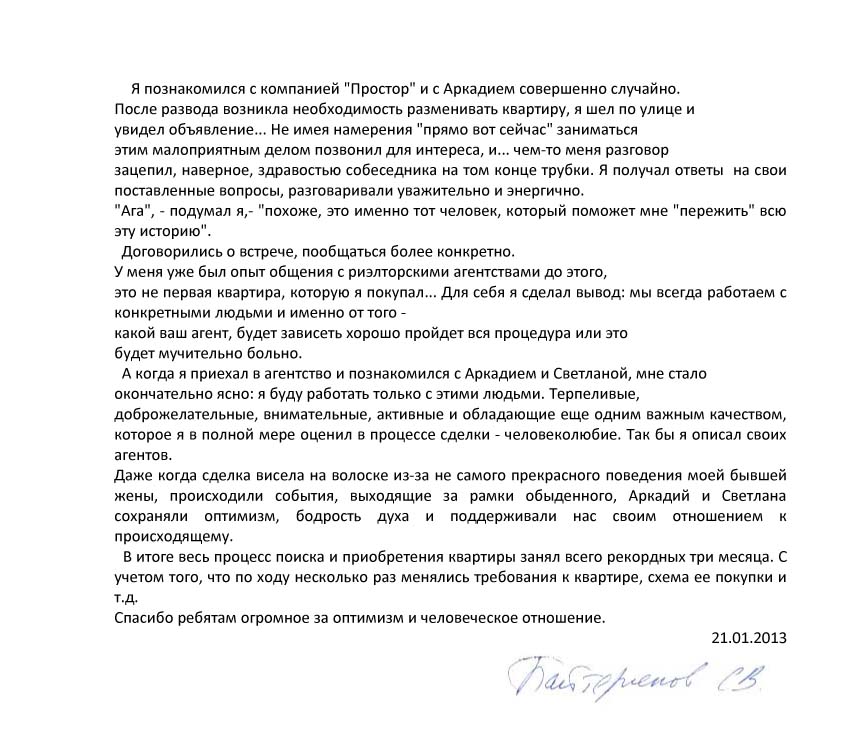 Я познакомился с компанией "Простор" и с Аркадием совершенно случайно. После развода возникла необходимость разменивать квартиру, я шел по улице и увидел объявление... Не имея намерения "прямо вот сейчас" заниматься этим малоприятным делом позвонил для интереса, и... чем-то меня разговор зацепил, наверное, здравостью собеседника на том конце трубки. Я получал ответы на свои поставленные вопросы, разговаривали уважительно и энергично. "Ага", - подумал я,- "похоже, это именно тот человек, который поможет мне "пережить" всю эту историю". Договорились о встрече, пообщаться более конкретно. У меня уже был опыт общения с риэлторскими агентствами до этого, это не первая квартира, которую я покупал... Для себя я сделал вывод: мы всегда работаем с конкретными людьми и именно от того - какой ваш агент, будет зависеть хорошо пройдет вся процедура или это будет мучительно больно. А когда я приехал в агентство и познакомился с Аркадием и Светланой, мне стало окончательно ясно: я буду работать только с этими людьми. Терпеливые, доброжелательные, внимательные, активные и обладающие еще одним важным качеством, которое я в полной мере оценил в процессе сделки - человеколюбие. Так бы я описал своих агентов. Даже когда сделка висела на волоске из-за не самого прекрасного поведения моей бывшей жены, происходили события, выходящие за рамки обыденного, Аркадий и Светлана сохраняли оптимизм, бодрость духа и поддерживали нас своим отношением к происходящему. В итоге весь процесс поиска и приобретения квартиры занял всего рекордных три месяца. С учетом того, что по ходу несколько раз менялись требования к квартире, схема ее покупки и т.д. Спасибо ребятам огромное за оптимизм и человеческое отношение.